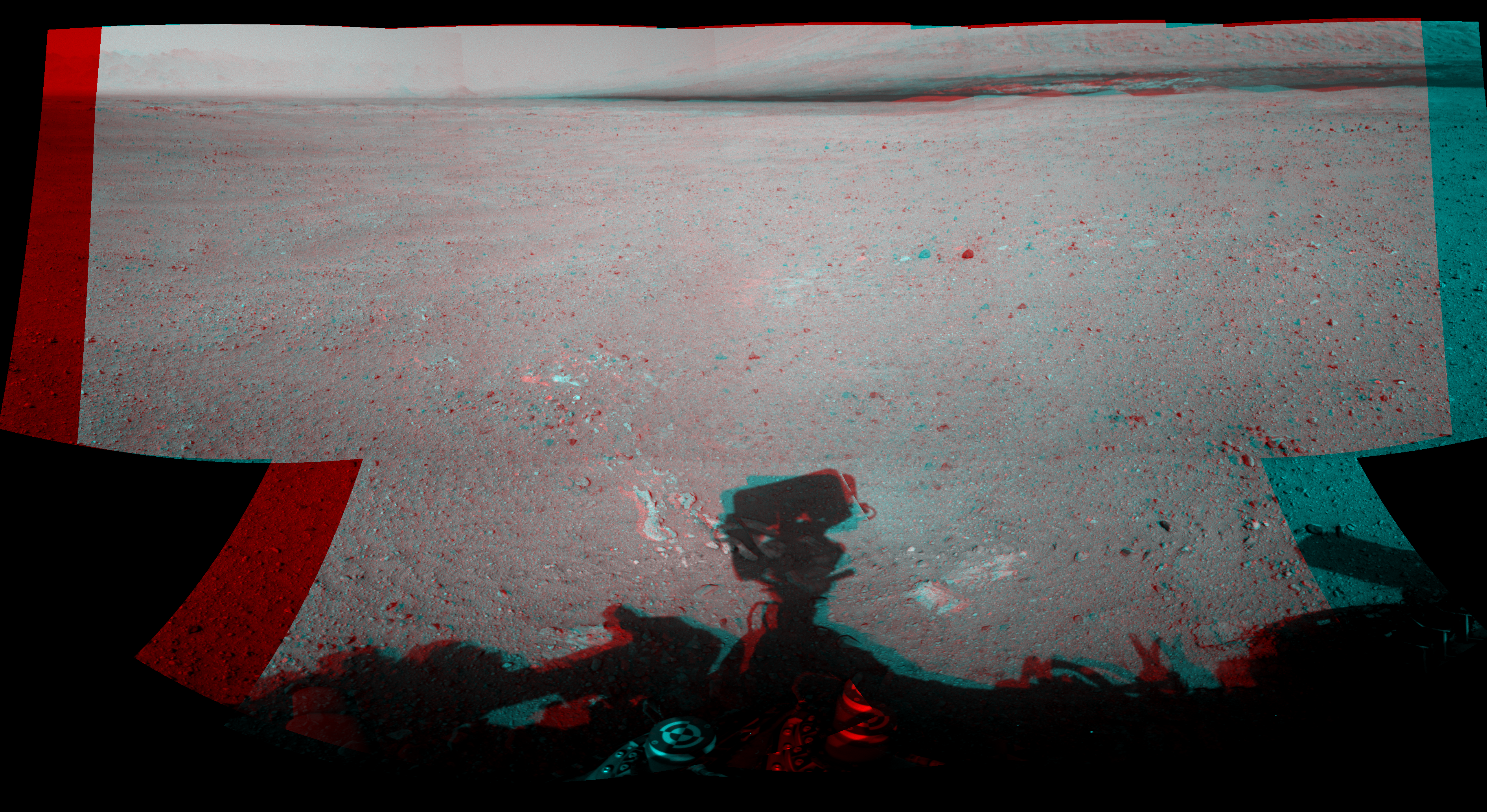 NASA's Mars rover Curiosity took 8 image pairs in Gale Crater using its mast-mounted Navigation Camera (Navcam) to create this mosaic. The seam-corrected mosaic provides a 174-degree cylindrical perspective projection panorama of the Martian surface suitable for stereo viewing, centered at 55 degrees azimuth (measured clockwise from north). This anaglyph must be viewed with red/blue glasses (red over left eye). Curiosity took the images on September 02, 2012, Sol 26 of the Mars Science Laboratory mission at drive 530, site number 3. The local mean solar time for the image exposures was 2 PM. Each Navcam image has a 45-degree field of view. CREDIT: NASA/JPL-Caltech