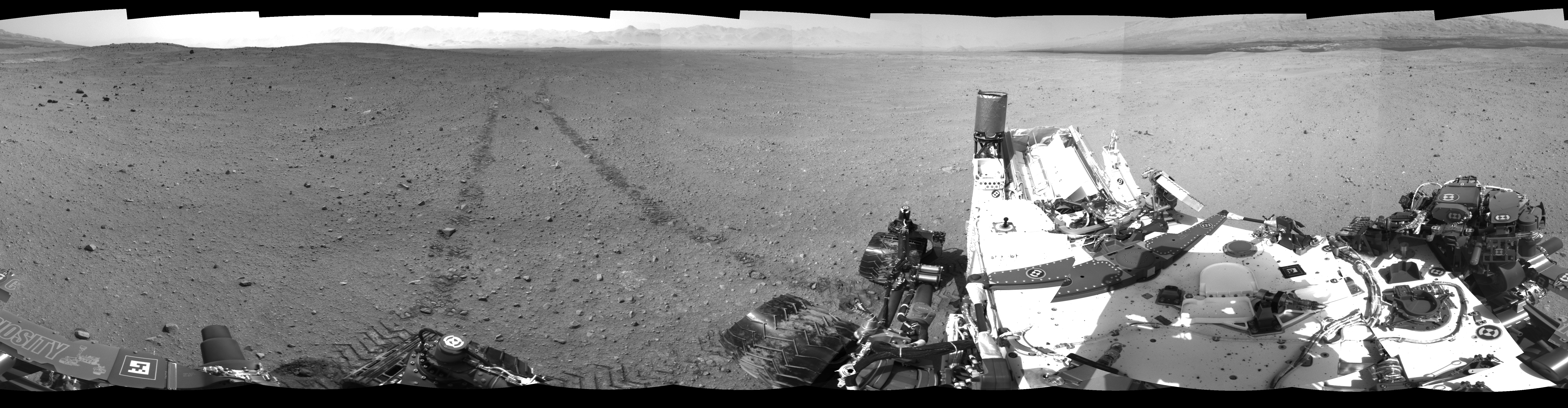 NASA's Mars rover Curiosity took 24 images in Gale Crater using its mast-mounted Left Navigation Camera (Navcam) to create this mosaic. The seam-corrected mosaic provides a 360-degree cylindrical-perspective projection panorama of the Martian surface suitable for stereo viewing, centered at 140 degrees azimuth (measured clockwise from north). This single-eye view must be combined with the partner right image to be viewed in stereo. Curiosity took the images on September 05, 2012, Sol 29 of the Mars Science Laboratory mission at drive 0, site number 4. The local mean solar time for the image exposures was 2 PM. Each Navcam image has a 45-degree field of view. CREDIT: NASA/JPL-Caltech
