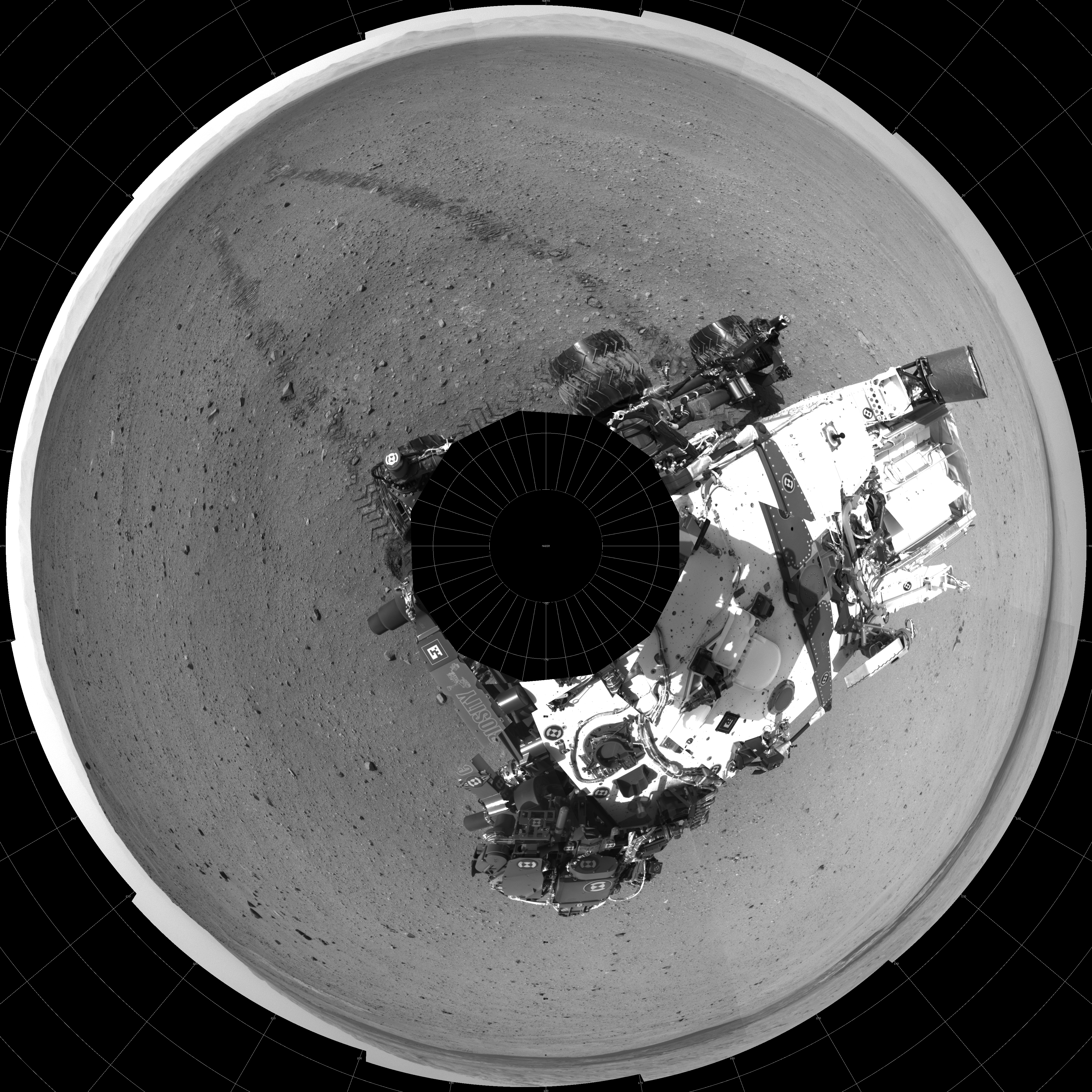 NASA's Mars rover Curiosity took 24 images in Gale Crater using its mast-mounted Left Navigation Camera (Navcam) to create this mosaic. The seam-corrected mosaic provides a polar stereographic projection panorama of the Martian surface with 0 degrees azimuth (measured clockwise from north) at the top of the image. Curiosity took the images on September 05, 2012, Sol 29 of the Mars Science Laboratory mission at drive 0, site number 4. The local mean solar time for the image exposures was 2 PM. Each Navcam image has a 45-degree field of view. CREDIT: NASA/JPL-Caltech