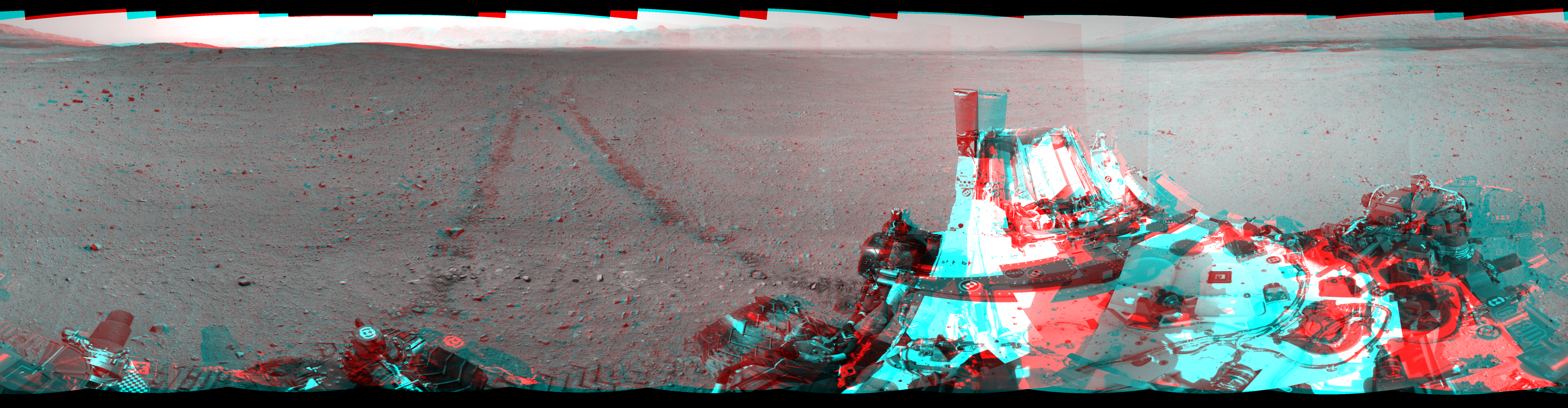 NASA's Mars rover Curiosity took 24 image pairs in Gale Crater using its mast-mounted Navigation Camera (Navcam) to create this mosaic. The seam-corrected mosaic provides a 360-degree cylindrical perspective projection panorama of the Martian surface suitable for stereo viewing, centered at 140 degrees azimuth (measured clockwise from north). This anaglyph must be viewed with red/blue glasses (red over left eye). Curiosity took the images on September 05, 2012, Sol 29 of the Mars Science Laboratory mission at drive 0, site number 4. The local mean solar time for the image exposures was 2 PM. Each Navcam image has a 45-degree field of view. CREDIT: NASA/JPL-Caltech