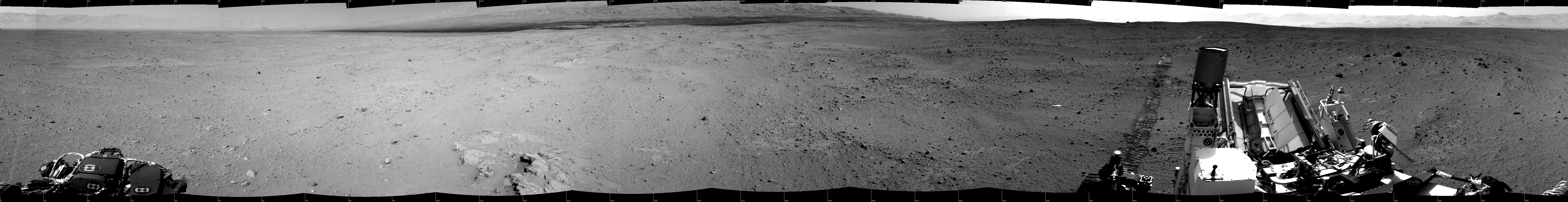 NASA's Mars rover Curiosity took 12 images in Gale Crater using its mast-mounted Left Navigation Camera (Navcam) to create this mosaic. The seam-corrected mosaic provides a 360-degree cylindrical projection panorama of the Martian surface centered at 180 degrees azimuth (measured clockwise from north). Curiosity took the images on September 14, 2012, Sol 38 of the Mars Science Laboratory mission at drive 404, site number 4. The local mean solar time for the image exposures was 2 PM. Each Navcam image has a 45 degree field of view. CREDIT: NASA/JPL-Caltech
