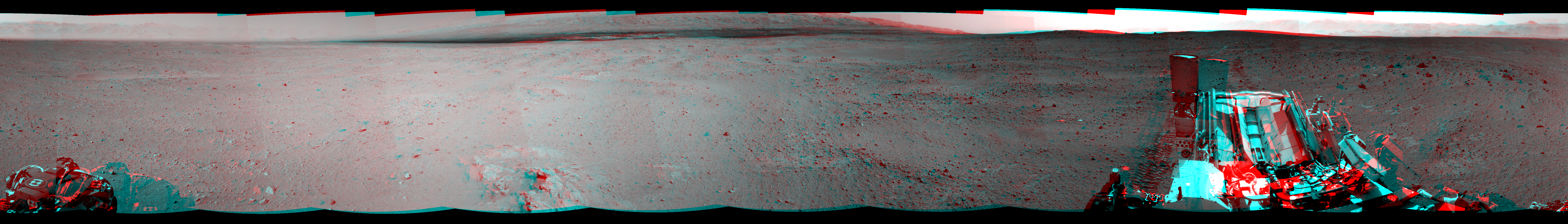 NASA's Mars rover Curiosity took 12 image pairs in Gale Crater using its mast-mounted Navigation Camera (Navcam) to create this mosaic. The seam-corrected mosaic provides a 360-degree cylindrical perspective projection panorama of the Martian surface suitable for stereo viewing, centered at 89 degrees azimuth (measured clockwise from north). This anaglyph must be viewed with red/blue glasses (red over left eye). Curiosity took the images on September 14, 2012, Sol 38 of the Mars Science Laboratory mission at drive 404, site number 4. The local mean solar time for the image exposures was 2 PM. Each Navcam image has a 45-degree field of view. CREDIT: NASA/JPL-Caltech