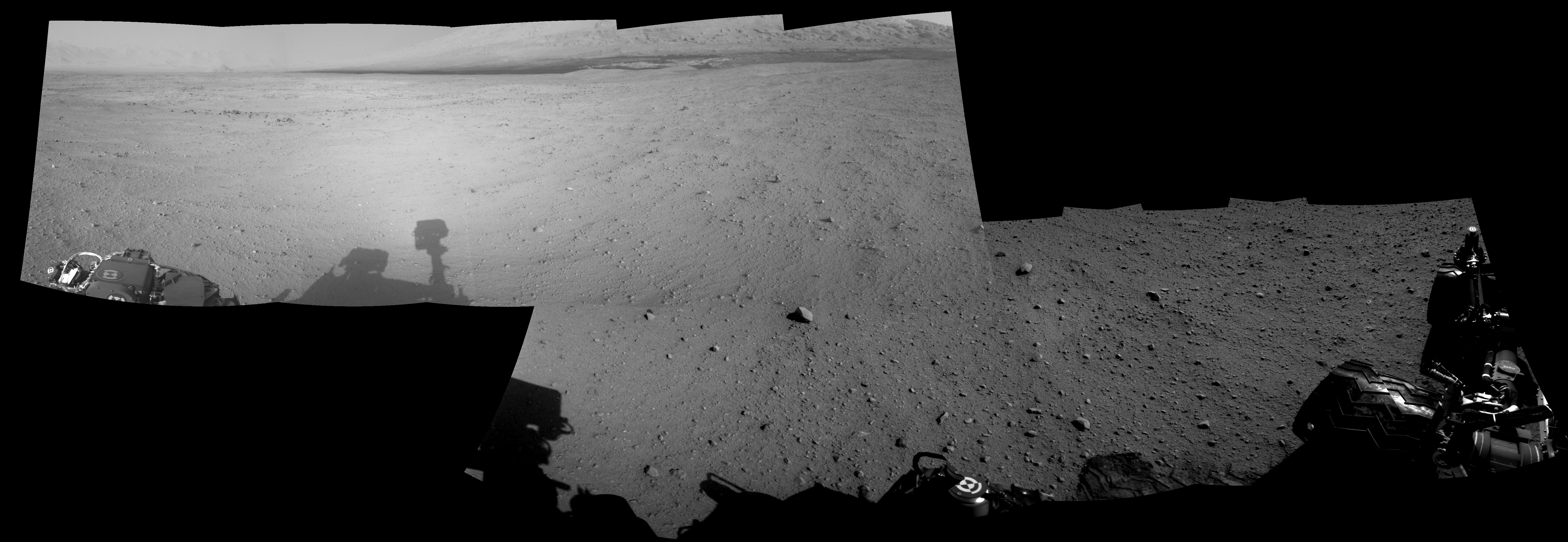 NASA's Mars rover Curiosity took 10 images in Gale Crater using its mast-mounted Left Navigation Camera (Navcam) to create this mosaic. The seam-corrected mosaic provides a 276-degree cylindrical-perspective projection panorama of the Martian surface suitable for stereo viewing, centered at 49 degrees azimuth (measured clockwise from north). This single-eye view must be combined with the partner right image to be viewed in stereo. Curiosity took the images on September 18, 2012, Sol 42 of the Mars Science Laboratory mission at drive 1632, site number 4. The local mean solar time for the image exposures was from 4 PM to 2 PM. Each Navcam image has a 45-degree field of view. CREDIT: NASA/JPL-Caltech