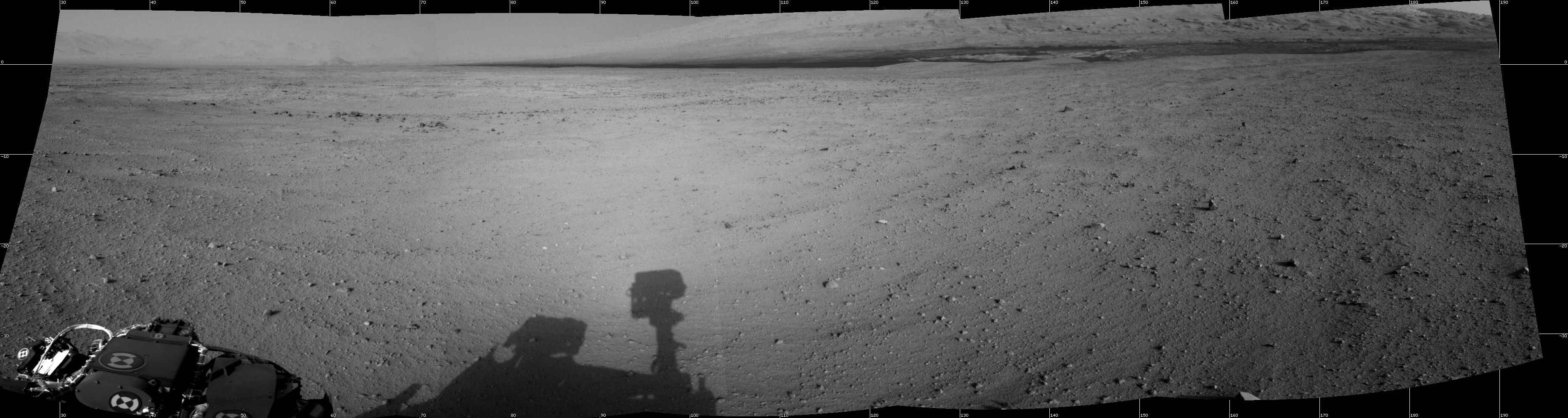 NASA's Mars rover Curiosity took 5 images in Gale Crater using its mast-mounted Left Navigation Camera (Navcam) to create this mosaic. The seam-corrected mosaic provides a 174-degree cylindrical projection panorama of the Martian surface centered at 110 degrees azimuth (measured clockwise from north). Curiosity took the images on September 18, 2012, Sol 42 of the Mars Science Laboratory mission at drive 1632, site number 4. The local mean solar time for the image exposures was 4 PM. Each Navcam image has a 45 degree field of view. CREDIT: NASA/JPL-Caltech