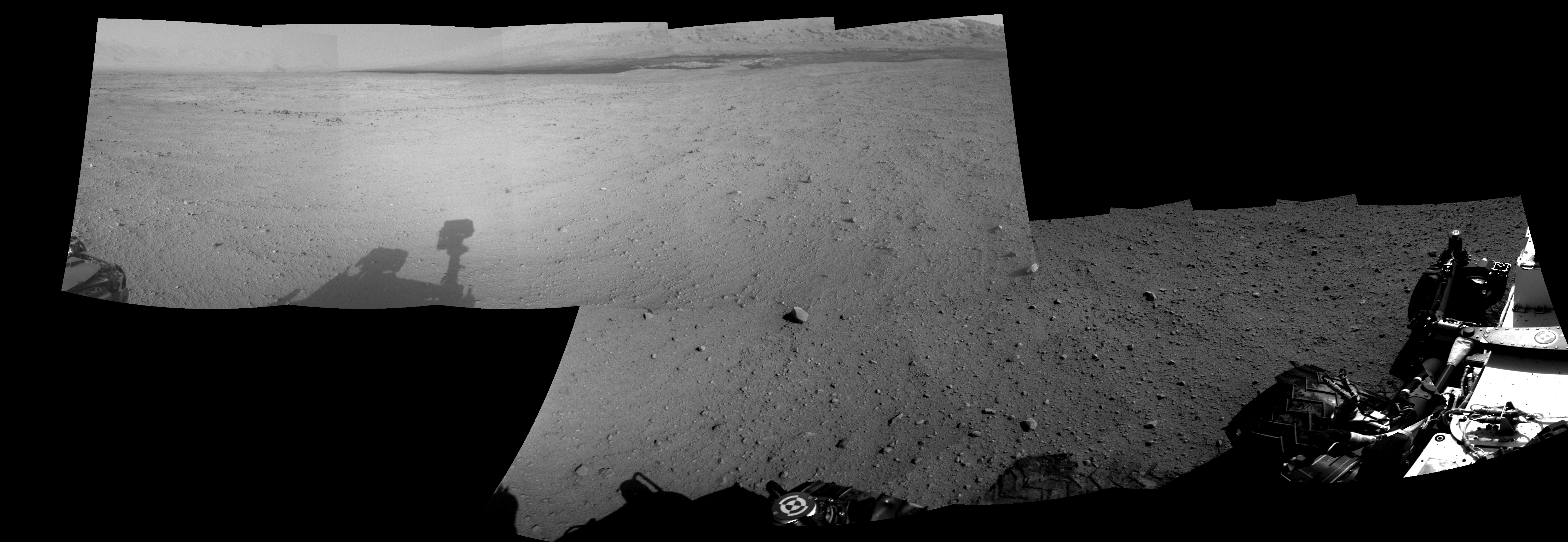 NASA's Mars rover Curiosity took 10 images in Gale Crater using its mast-mounted Right Navigation Camera (Navcam) to create this mosaic. The seam-corrected mosaic provides a 276-degree cylindrical-perspective projection panorama of the Martian surface suitable for stereo viewing, centered at 40 degrees azimuth (measured clockwise from north). This single-eye view must be combined with the partner left image to be viewed in stereo. Curiosity took the images on September 18, 2012, Sol 42 of the Mars Science Laboratory mission at drive 1632, site number 4. The local mean solar time for the image exposures was from 4 PM to 2 PM. Each Navcam image has a 45-degree field of view. CREDIT: NASA/JPL-Caltech