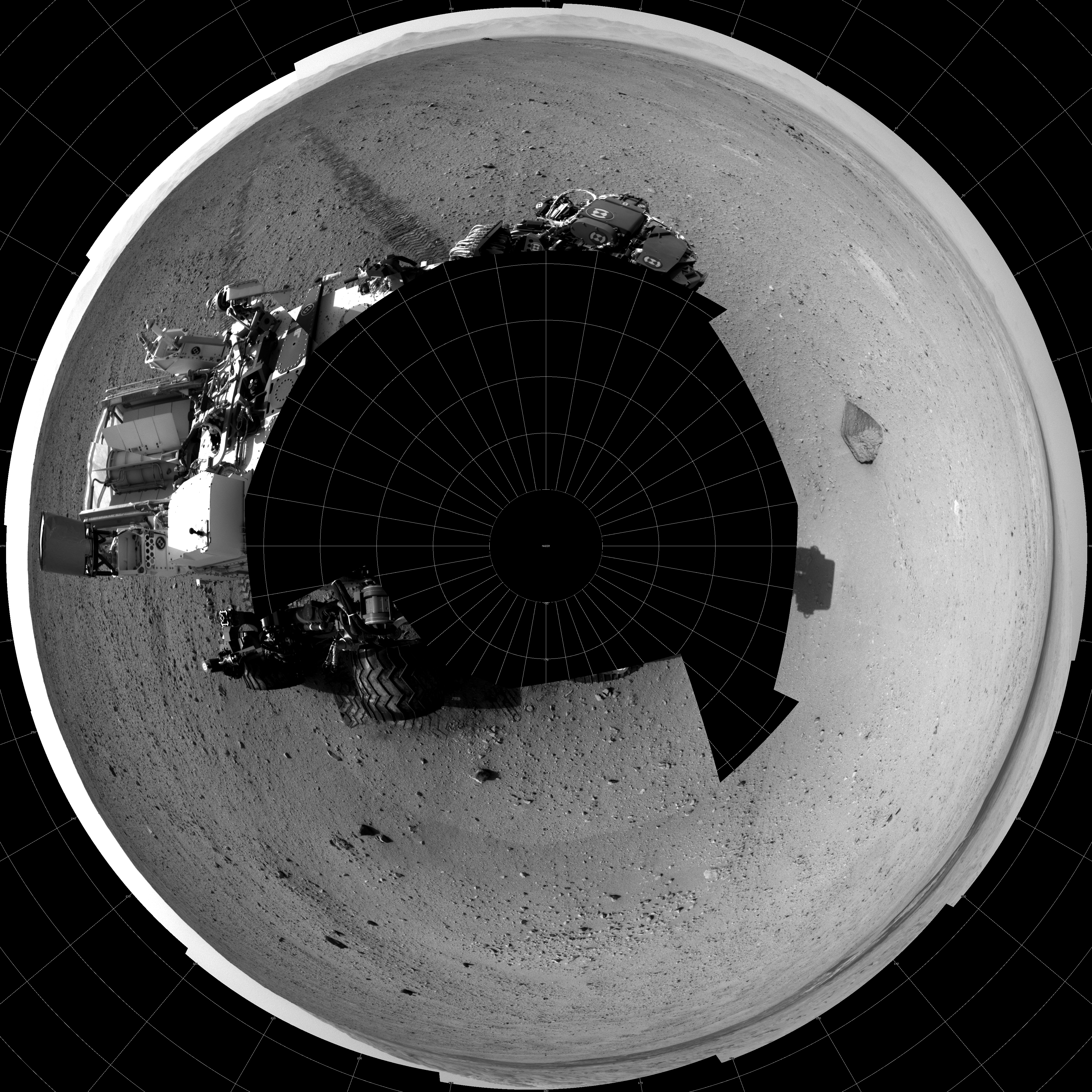 NASA's Mars rover Curiosity took 17 images in Gale Crater using its mast-mounted Left Navigation Camera (Navcam) to create this mosaic. The seam-corrected mosaic provides a polar stereographic projection panorama of the Martian surface with 0 degrees azimuth (measured clockwise from north) at the top of the image. Curiosity took the images on September 19, 2012, Sol 43 of the Mars Science Laboratory mission at drive 2002, site number 4. The local mean solar time for the image exposures was 2 PM. Each Navcam image has a 45-degree field of view. CREDIT: NASA/JPL-Caltech