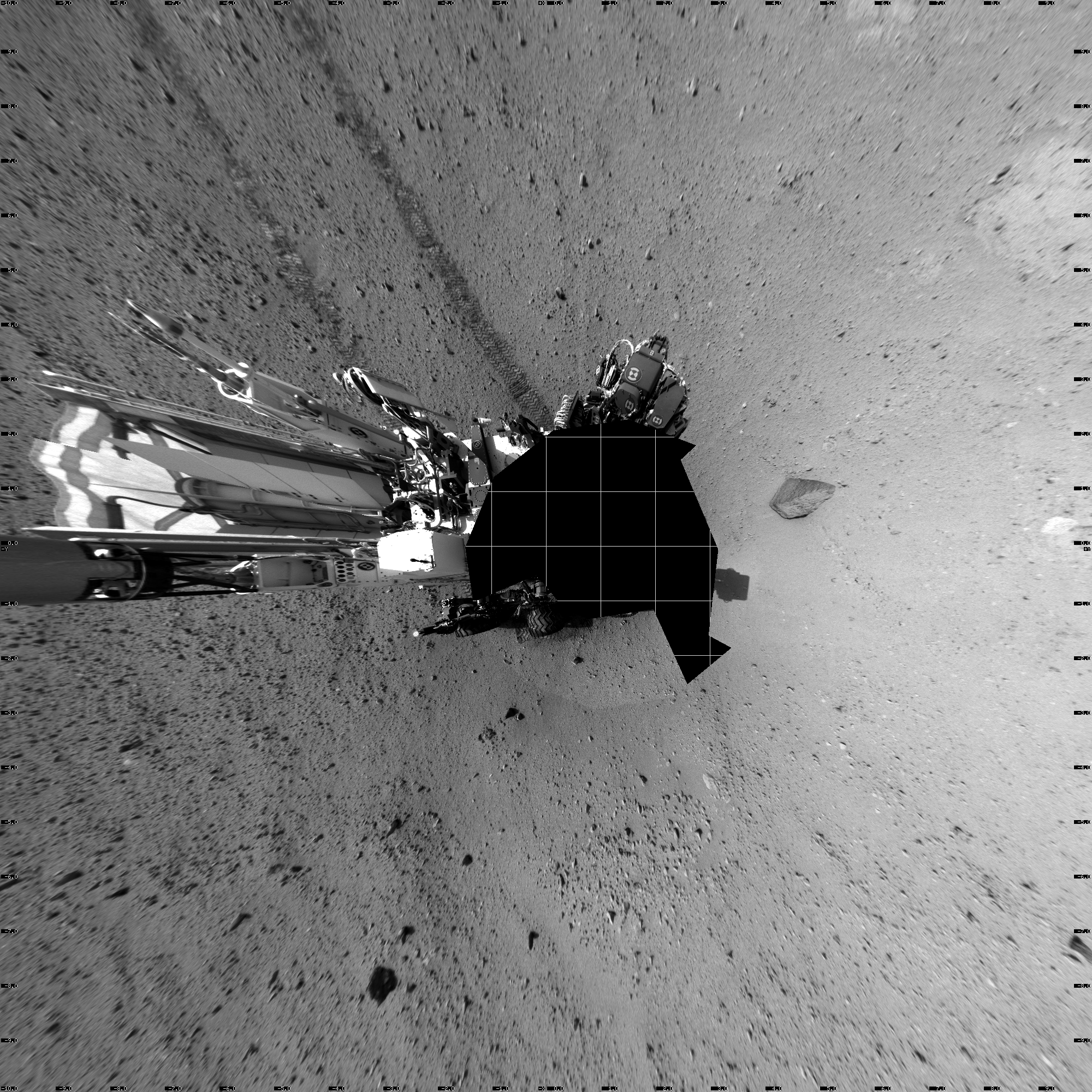 NASA's Mars rover Curiosity took 17 images in Gale Crater using its mast-mounted Left Navigation Camera (Navcam) to create this mosaic. The seam-corrected mosaic provides a vertical projection of the Martian surface near the rover, covering an area of 20 meters (north/south) by 20 meters (east/west). North is up in the image. This projection provides an overhead view, but introduces distortion for items not on the surface, such as large rocks and the rover itself. Curiosity took the images on September 19, 2012, Sol 43 of the Mars Science Laboratory mission at drive 2002, site number 4. The local mean solar time for the image exposures was 2 PM. Each Navcam image has a 45-degree field of view. CREDIT: NASA/JPL-Caltech
