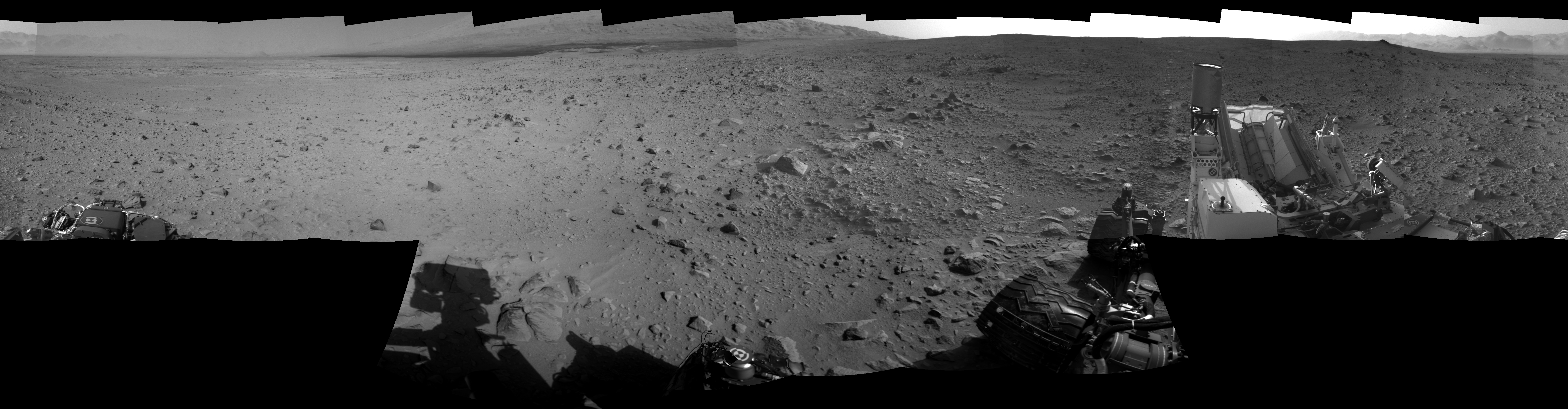NASA's Mars rover Curiosity took 17 images in Gale Crater using its mast-mounted Left Navigation Camera (Navcam) to create this mosaic. The seam-corrected mosaic provides a 360-degree cylindrical-perspective projection panorama of the Martian surface suitable for stereo viewing, centered at 91 degrees azimuth (measured clockwise from north). This single-eye view must be combined with the partner right image to be viewed in stereo. Curiosity took the images on September 26, 2012, Sol 49 of the Mars Science Laboratory mission at drive 2778, site number 4. The local mean solar time for the image exposures was 2 PM. Each Navcam image has a 45-degree field of view. CREDIT: NASA/JPL-Caltech