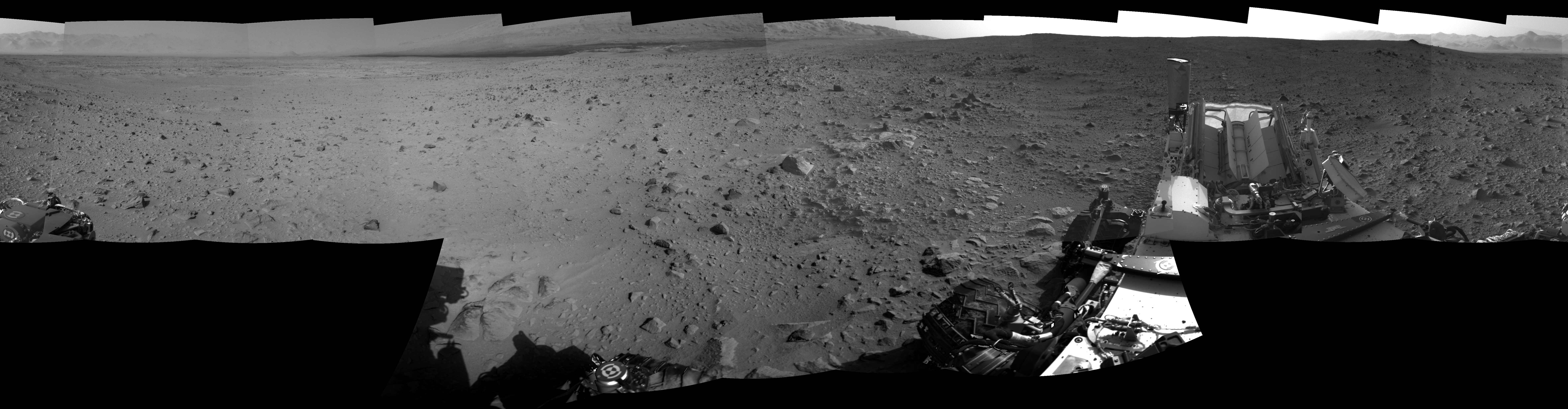 NASA's Mars rover Curiosity took 17 images in Gale Crater using its mast-mounted Right Navigation Camera (Navcam) to create this mosaic. The seam-corrected mosaic provides a 360-degree cylindrical-perspective projection panorama of the Martian surface suitable for stereo viewing, centered at 84 degrees azimuth (measured clockwise from north). This single-eye view must be combined with the partner left image to be viewed in stereo. Curiosity took the images on September 26, 2012, Sol 49 of the Mars Science Laboratory mission at drive 2778, site number 4. The local mean solar time for the image exposures was 2 PM. Each Navcam image has a 45-degree field of view. CREDIT: NASA/JPL-Caltech