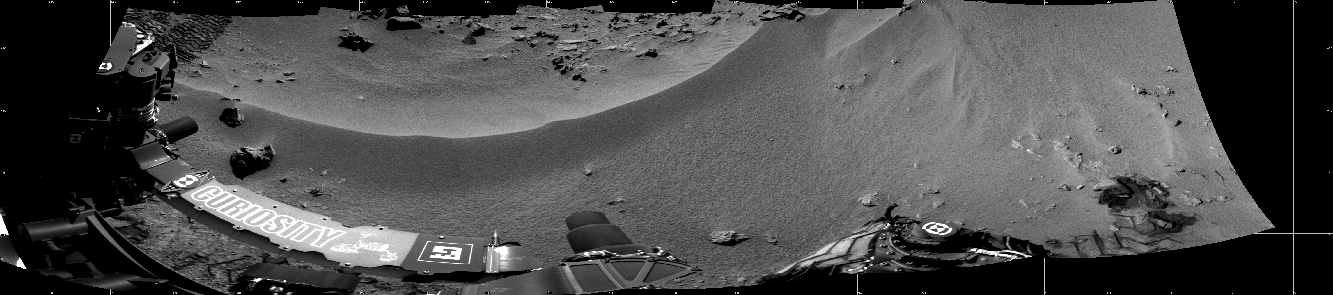 NASA's Mars rover Curiosity took 5 images in Gale Crater using its mast-mounted Left Navigation Camera (Navcam) to create this mosaic. The seam-corrected mosaic provides a 214-degree cylindrical projection panorama of the Martian surface centered at 309 degrees azimuth (measured clockwise from north). Curiosity took the images on October 03, 2012, Sol 56 of the Mars Science Laboratory mission at drive 3474, site number 4. The local mean solar time for the image exposures was 2 PM. Each Navcam image has a 45 degree field of view. CREDIT: NASA/JPL-Caltech
