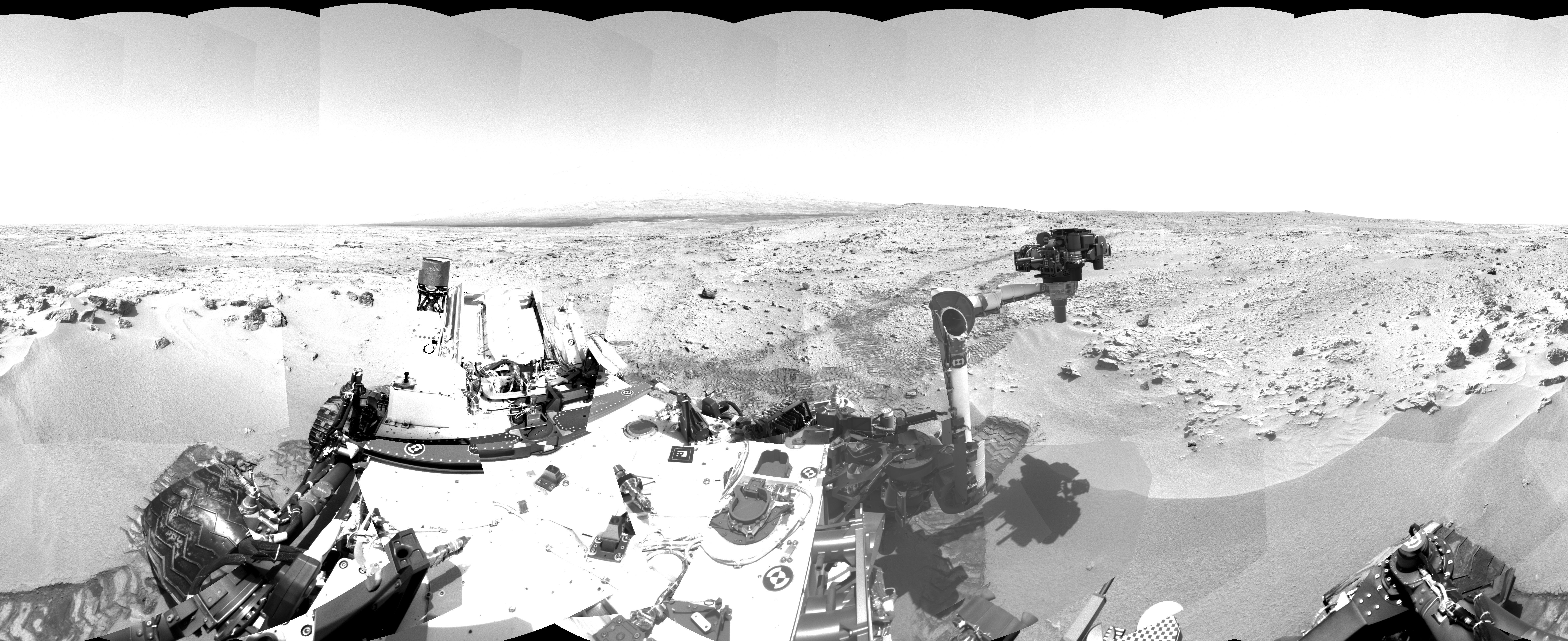 NASA's Mars rover Curiosity took 36 images in Gale Crater using its mast-mounted Right Navigation Camera (Navcam) to create this mosaic. The seam-corrected mosaic provides a 360-degree cylindrical-perspective projection panorama of the Martian surface suitable for stereo viewing, centered at 254 degrees azimuth (measured clockwise from north). This single-eye view must be combined with the partner left image to be viewed in stereo. Curiosity took the images on October 06, 2012, Sols 59-60 of the Mars Science Laboratory mission at drive 104, site number 5. The local mean solar time for the image exposures was from 2 PM to 12 PM. Each Navcam image has a 45-degree field of view. CREDIT: NASA/JPL-Caltech