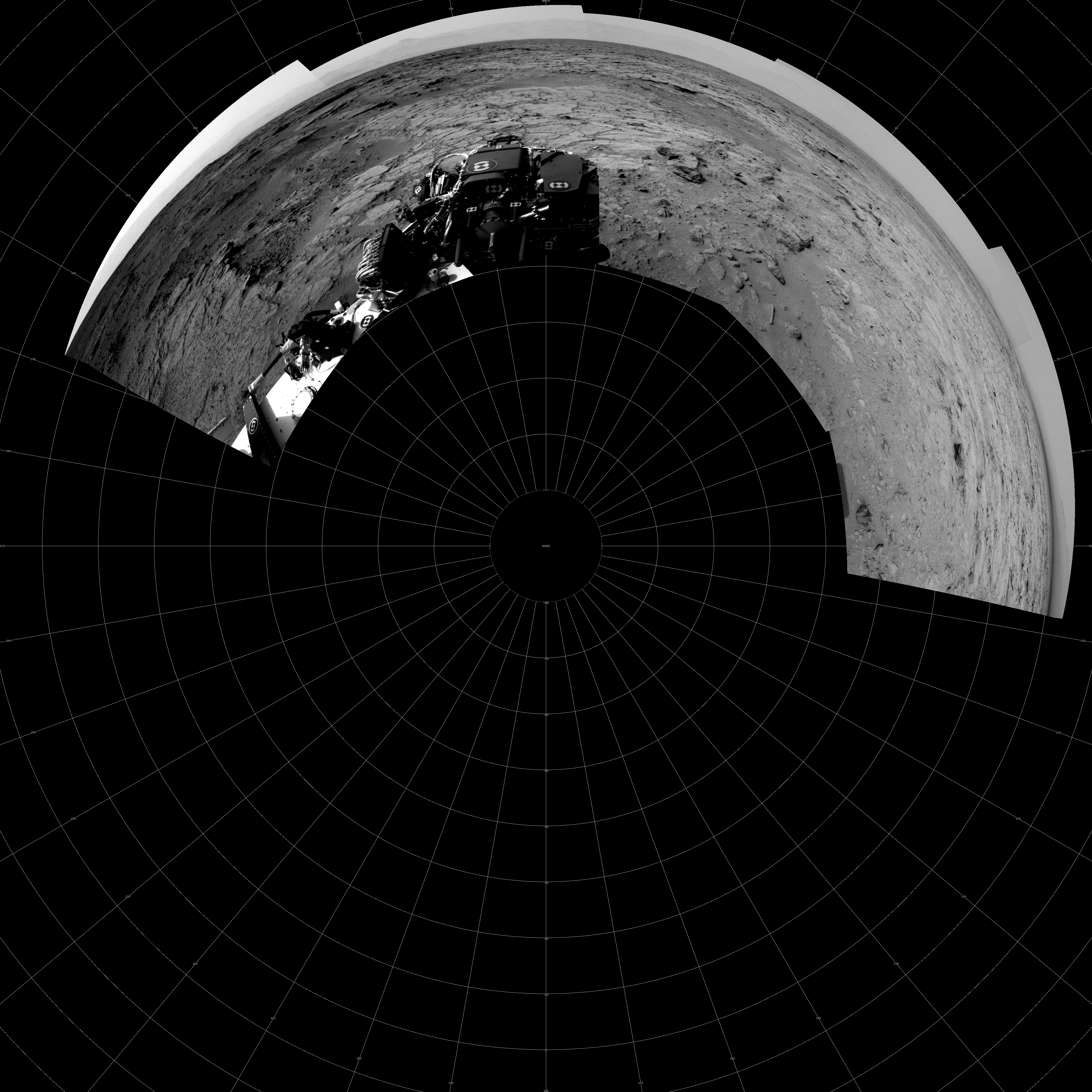 NASA's Mars rover Curiosity took 5 images in Gale Crater using its mast-mounted Left Navigation Camera (Navcam) to create this mosaic. The seam-corrected mosaic provides a polar stereographic projection panorama of the Martian surface with 0 degrees azimuth (measured clockwise from north) at the top of the image. Curiosity took the images on November 28, 2012, Sol 111 of the Mars Science Laboratory mission at drive 432, site number 5. The local mean solar time for the image exposures was 3 PM. Each Navcam image has a 45-degree field of view. CREDIT: NASA/JPL-Caltech