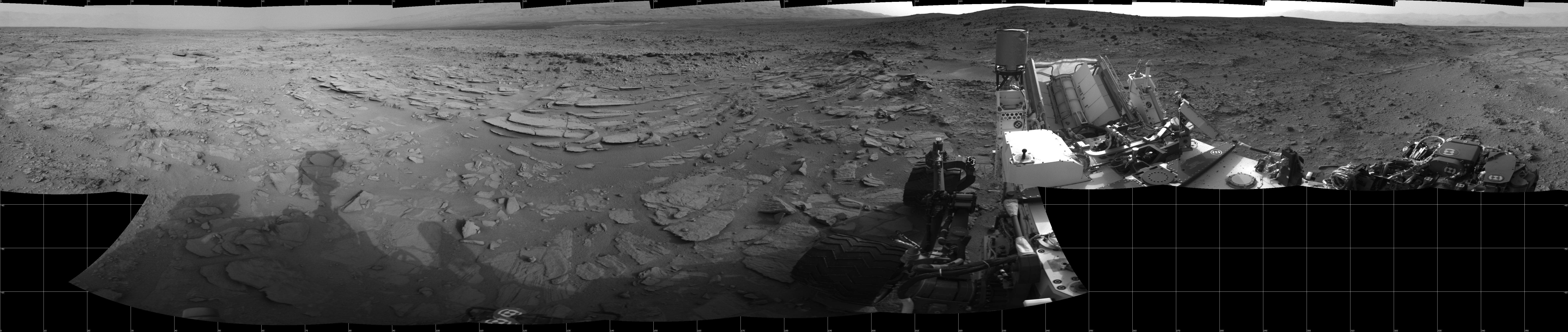 NASA's Mars rover Curiosity took 18 images in Gale Crater using its mast-mounted Left Navigation Camera (Navcam) to create this mosaic. The seam-corrected mosaic provides a 360-degree cylindrical projection panorama of the Martian surface centered at 180 degrees azimuth (measured clockwise from north). Curiosity took the images on December 08, 2012, Sol 120 of the Mars Science Laboratory mission at drive 742, site number 5. The local mean solar time for the image exposures was from 3 PM to 4 PM. Each Navcam image has a 45 degree field of view. CREDIT: NASA/JPL-Caltech