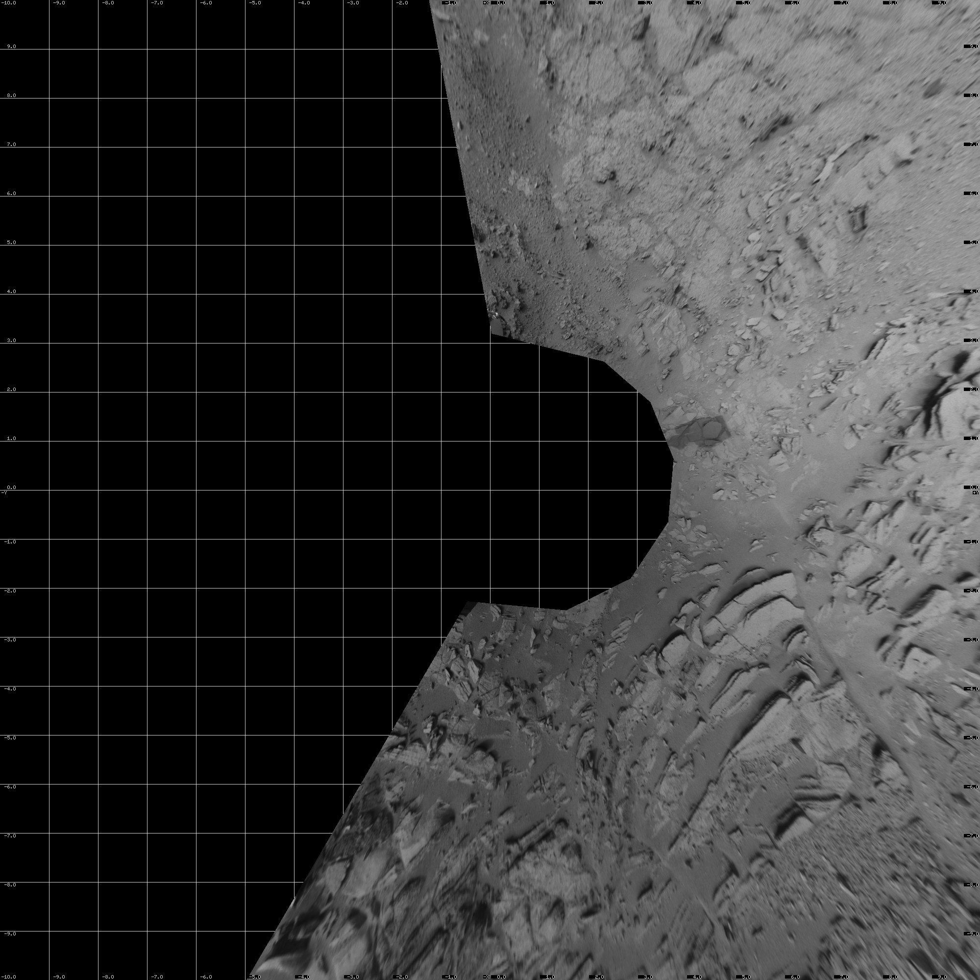 NASA's Mars rover Curiosity took 7 images in Gale Crater using its mast-mounted Left Navigation Camera (Navcam) to create this mosaic. The seam-corrected mosaic provides a vertical projection of the Martian surface near the rover, covering an area of 20 meters (north/south) by 20 meters (east/west). North is up in the image. This projection provides an overhead view, but introduces distortion for items not on the surface, such as large rocks and the rover itself. Curiosity took the images on December 08, 2012, Sol 120 of the Mars Science Laboratory mission at drive 742, site number 5. The local mean solar time for the image exposures was 3 PM. Each Navcam image has a 45-degree field of view. CREDIT: NASA/JPL-Caltech