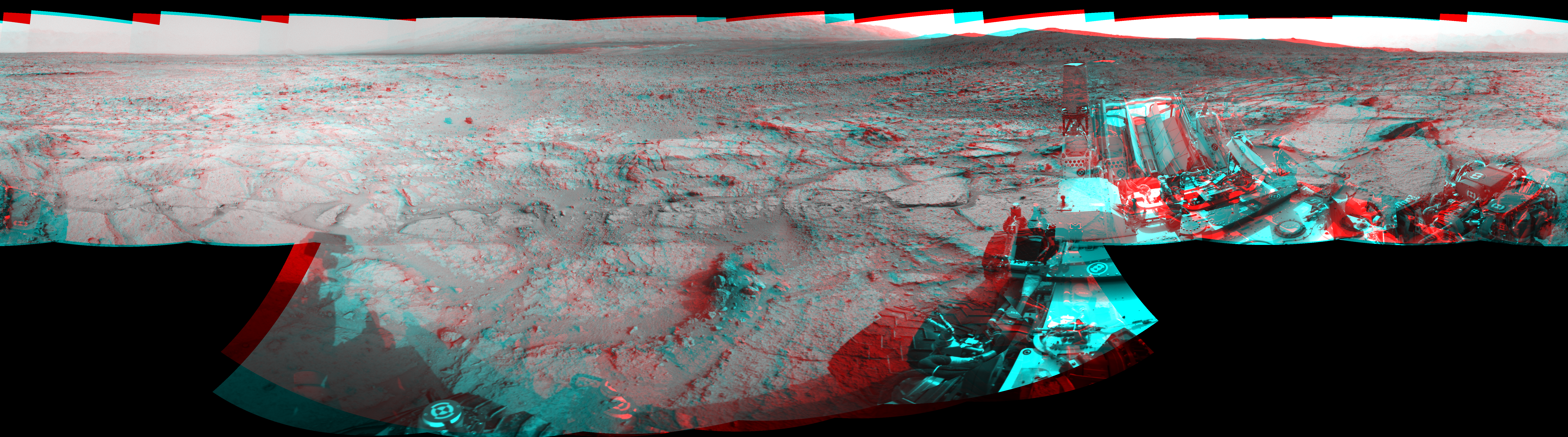 NASA's Mars rover Curiosity took 17 image pairs in Gale Crater using its mast-mounted Navigation Camera (Navcam) to create this mosaic. The seam-corrected mosaic provides a 360-degree cylindrical perspective projection panorama of the Martian surface suitable for stereo viewing, centered at 115 degrees azimuth (measured clockwise from north). This anaglyph must be viewed with red/blue glasses (red over left eye). Curiosity took the images on December 10, 2012, Sol 122 of the Mars Science Laboratory mission at drive 938, site number 5. The local mean solar time for the image exposures was 3 PM. Each Navcam image has a 45-degree field of view. CREDIT: NASA/JPL-Caltech