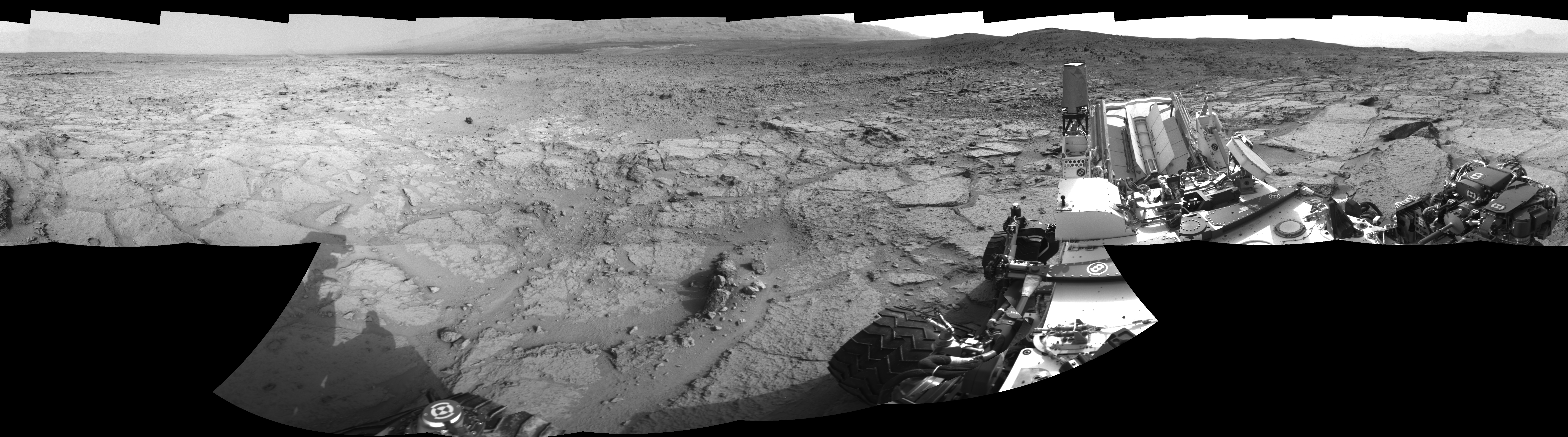NASA's Mars rover Curiosity took 17 images in Gale Crater using its mast-mounted Right Navigation Camera (Navcam) to create this mosaic. The seam-corrected mosaic provides a 360-degree cylindrical-perspective projection panorama of the Martian surface suitable for stereo viewing, centered at 108 degrees azimuth (measured clockwise from north). This single-eye view must be combined with the partner left image to be viewed in stereo. Curiosity took the images on December 10, 2012, Sol 122 of the Mars Science Laboratory mission at drive 938, site number 5. The local mean solar time for the image exposures was 3 PM. Each Navcam image has a 45-degree field of view. CREDIT: NASA/JPL-Caltech