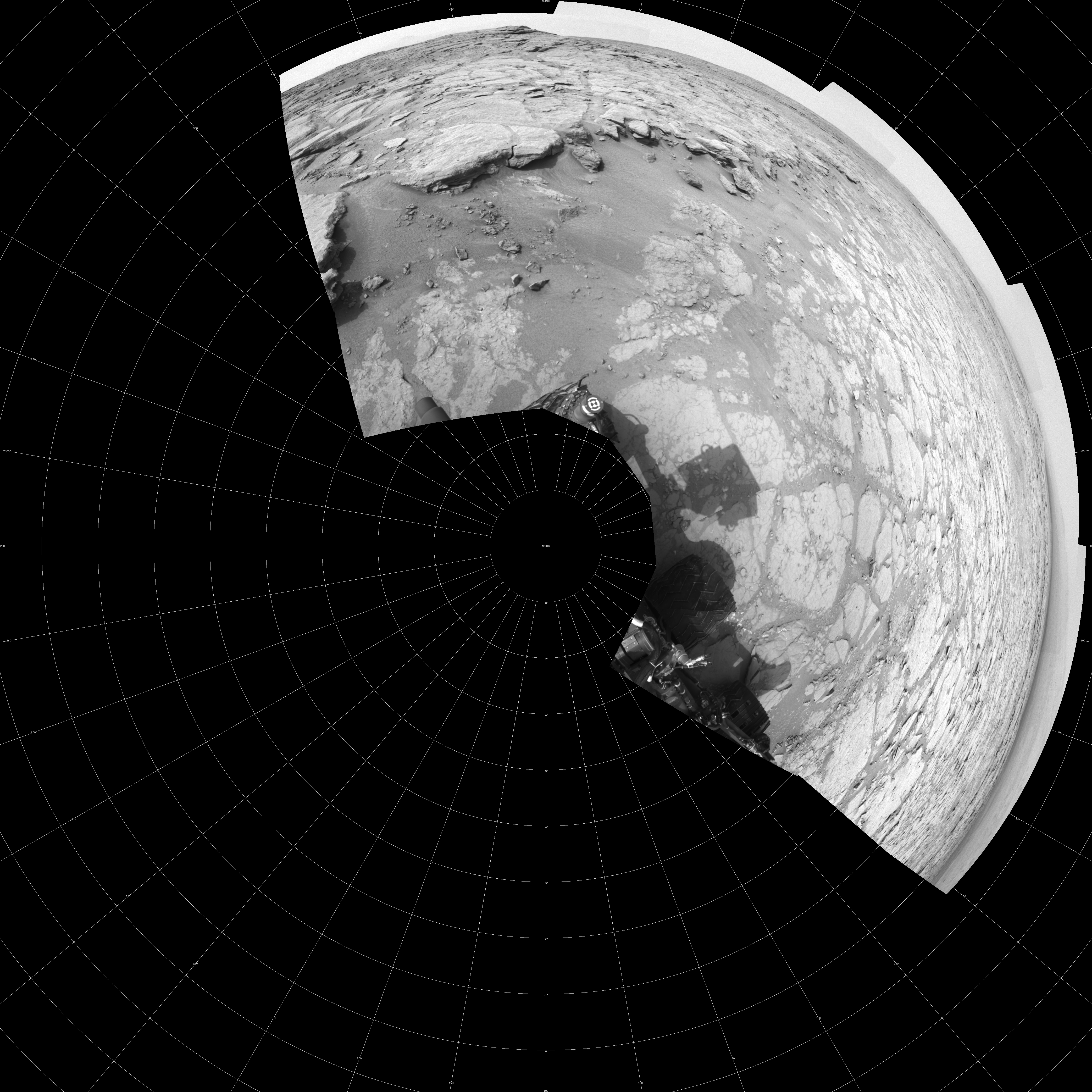 NASA's Mars rover Curiosity took 10 images in Gale Crater using its mast-mounted Left Navigation Camera (Navcam) to create this mosaic. The seam-corrected mosaic provides a polar stereographic projection panorama of the Martian surface with 0 degrees azimuth (measured clockwise from north) at the top of the image. Curiosity took the images on December 18, 2012, Sol 130 of the Mars Science Laboratory mission at drive 1662, site number 5. The local mean solar time for the image exposures was from 1 PM to 2 PM. Each Navcam image has a 45-degree field of view. CREDIT: NASA/JPL-Caltech
