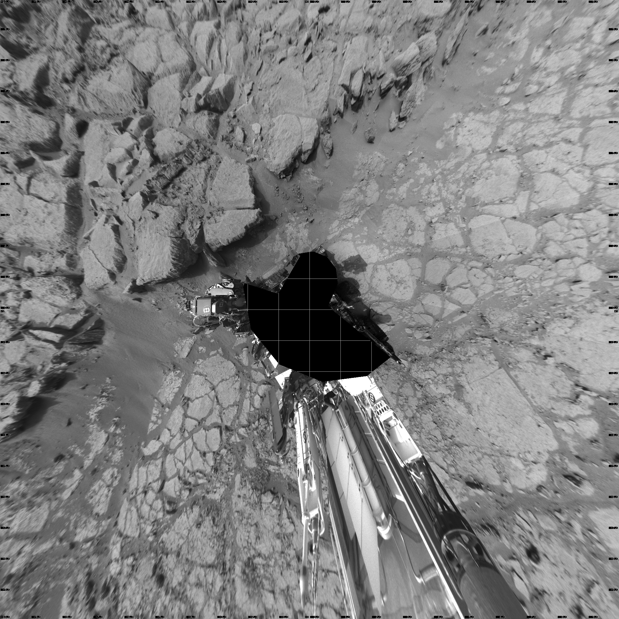 NASA's Mars rover Curiosity took 18 images in Gale Crater using its mast-mounted Left Navigation Camera (Navcam) to create this mosaic. The seam-corrected mosaic provides a vertical projection of the Martian surface near the rover, covering an area of 20 meters (north/south) by 20 meters (east/west). North is up in the image. This projection provides an overhead view, but introduces distortion for items not on the surface, such as large rocks and the rover itself. Curiosity took the images on December 19, 2012, Sol 131 of the Mars Science Laboratory mission at drive 1662, site number 5. The local mean solar time for the image exposures was 3 PM. Each Navcam image has a 45-degree field of view. CREDIT: NASA/JPL-Caltech