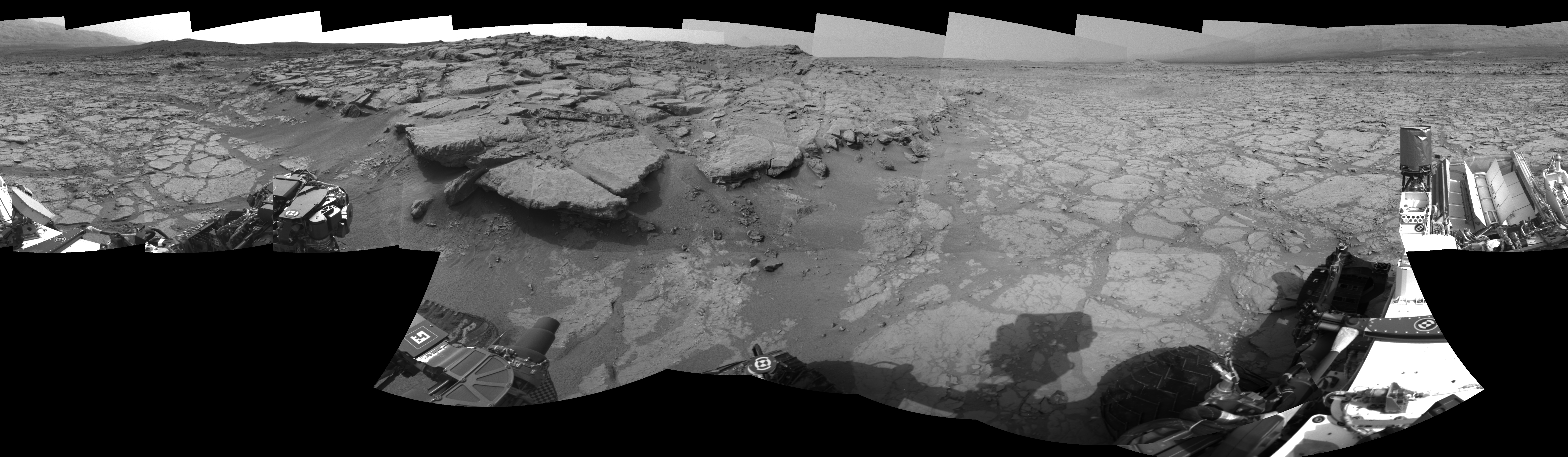 NASA's Mars rover Curiosity took 18 images in Gale Crater using its mast-mounted Right Navigation Camera (Navcam) to create this mosaic. The seam-corrected mosaic provides a 360-degree cylindrical-perspective projection panorama of the Martian surface suitable for stereo viewing, centered at 30 degrees azimuth (measured clockwise from north). This single-eye view must be combined with the partner left image to be viewed in stereo. Curiosity took the images on December 19, 2012, Sol 131 of the Mars Science Laboratory mission at drive 1662, site number 5. The local mean solar time for the image exposures was 3 PM. Each Navcam image has a 45-degree field of view. CREDIT: NASA/JPL-Caltech