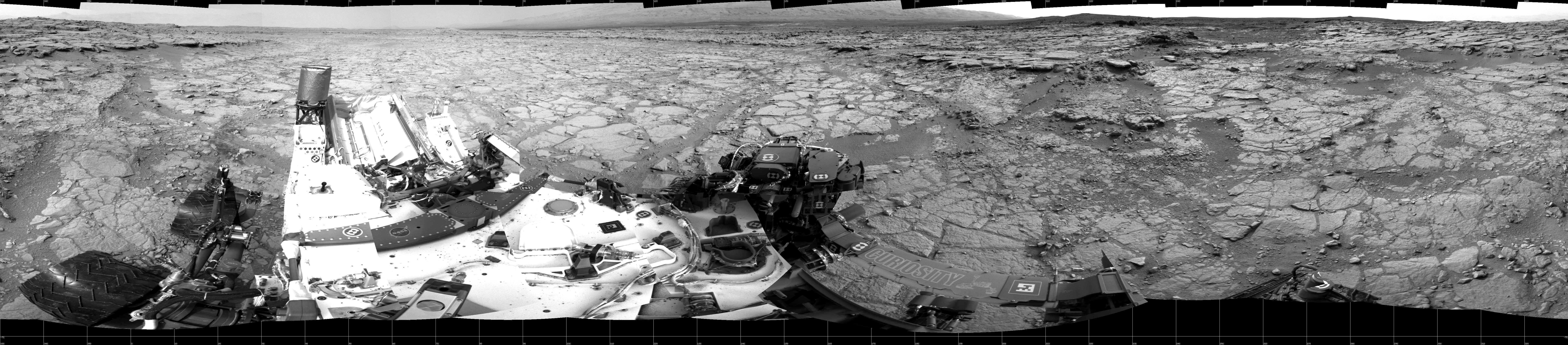 NASA's Mars rover Curiosity took 24 images in Gale Crater using its mast-mounted Left Navigation Camera (Navcam) to create this mosaic. The seam-corrected mosaic provides a 360-degree cylindrical projection panorama of the Martian surface centered at 150 degrees azimuth (measured clockwise from north). Curiosity took the images on December 21, 2012, Sols 133-134 of the Mars Science Laboratory mission at drive 1858, site number 5. The local mean solar time for the image exposures was from 2 PM to 5 PM. Each Navcam image has a 45 degree field of view. CREDIT: NASA/JPL-Caltech