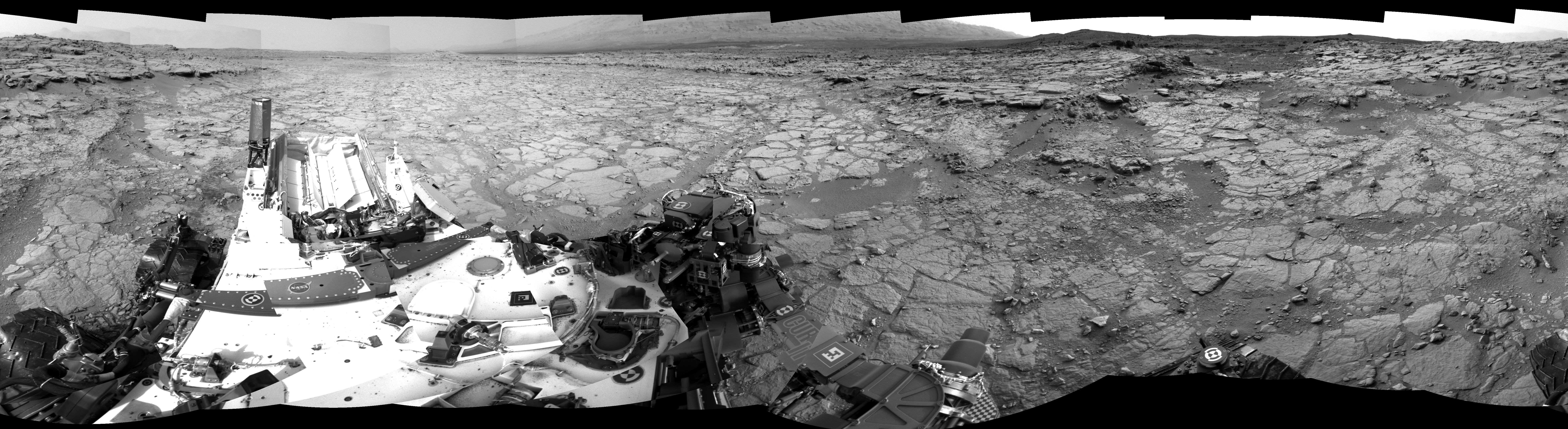 NASA's Mars rover Curiosity took 24 images in Gale Crater using its mast-mounted Right Navigation Camera (Navcam) to create this mosaic. The seam-corrected mosaic provides a 360-degree cylindrical-perspective projection panorama of the Martian surface suitable for stereo viewing, centered at 295 degrees azimuth (measured clockwise from north). This single-eye view must be combined with the partner left image to be viewed in stereo. Curiosity took the images on December 21, 2012, Sols 133-134 of the Mars Science Laboratory mission at drive 1858, site number 5. The local mean solar time for the image exposures was from 2 PM to 5 PM. Each Navcam image has a 45-degree field of view. CREDIT: NASA/JPL-Caltech