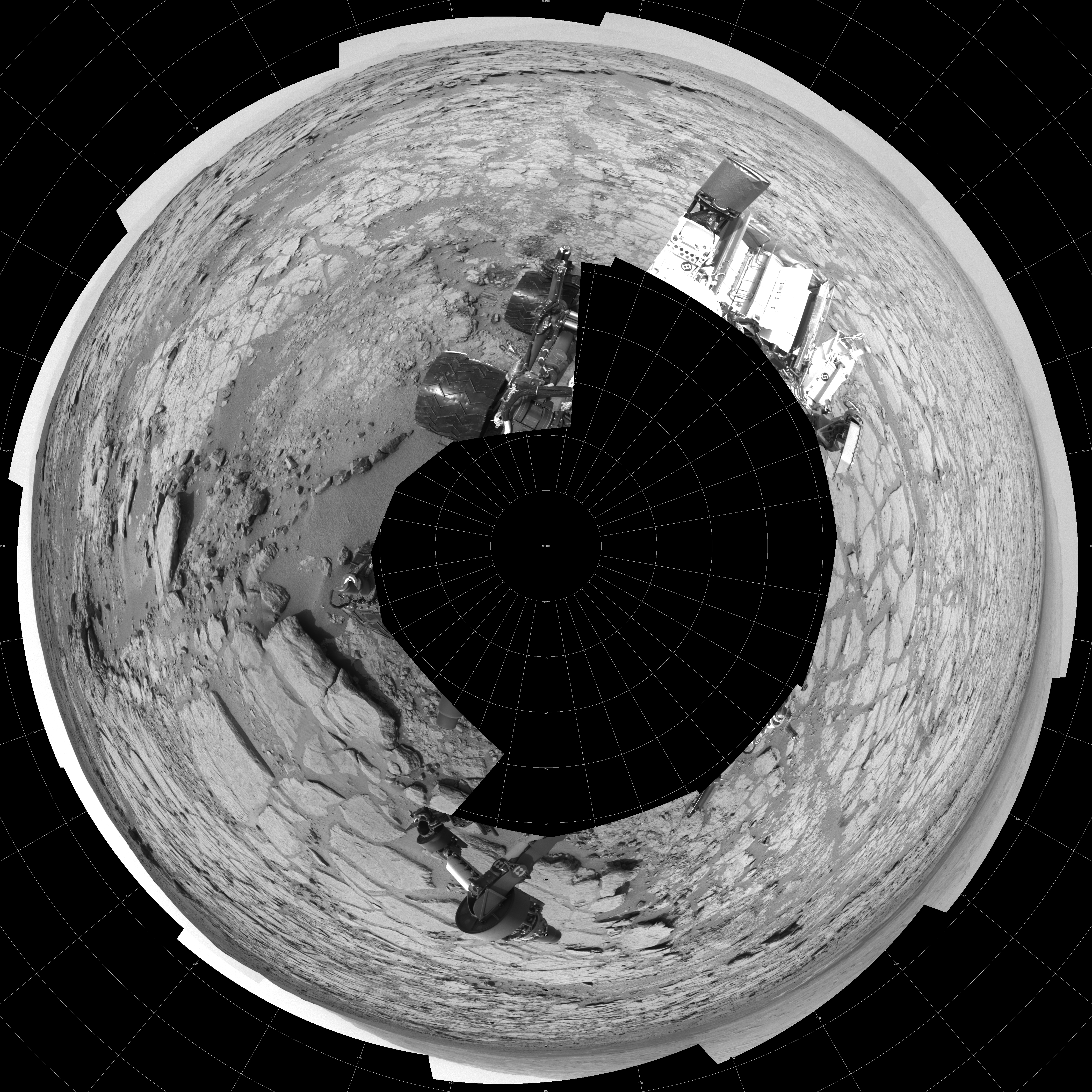 NASA's Mars rover Curiosity took 17 images in Gale Crater using its mast-mounted Left Navigation Camera (Navcam) to create this mosaic. The seam-corrected mosaic provides a polar stereographic projection panorama of the Martian surface with 0 degrees azimuth (measured clockwise from north) at the top of the image. Curiosity took the images on January 09, 2013, Sol 152 of the Mars Science Laboratory mission at drive 1954, site number 5. The local mean solar time for the image exposures was 1 PM. Each Navcam image has a 45-degree field of view. CREDIT: NASA/JPL-Caltech