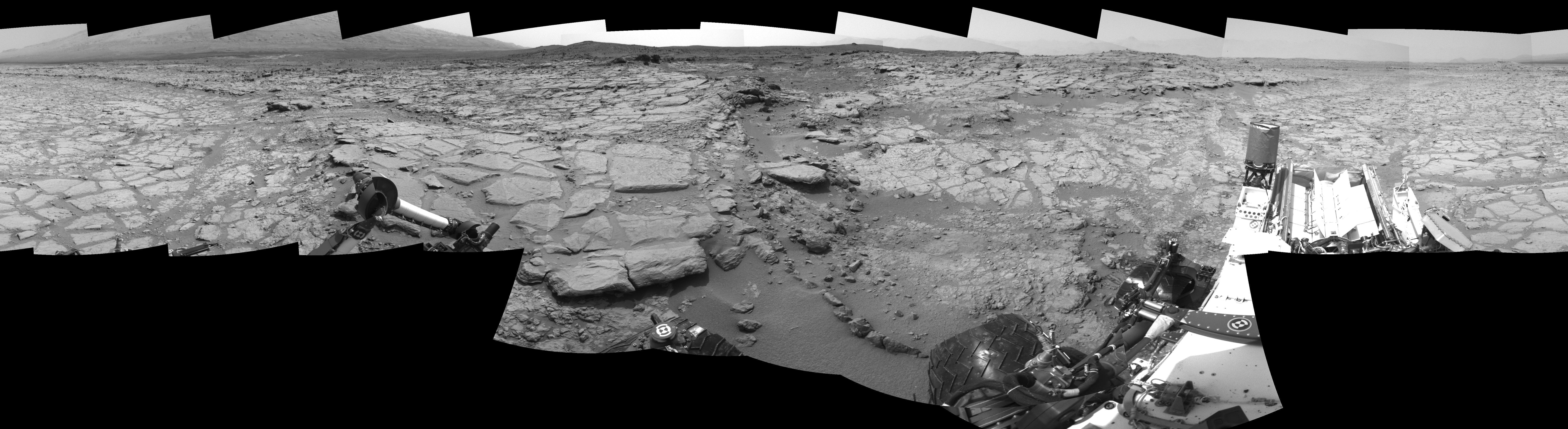 NASA's Mars rover Curiosity took 17 images in Gale Crater using its mast-mounted Right Navigation Camera (Navcam) to create this mosaic. The seam-corrected mosaic provides a 360-degree cylindrical-perspective projection panorama of the Martian surface suitable for stereo viewing, centered at 63 degrees azimuth (measured clockwise from north). This single-eye view must be combined with the partner left image to be viewed in stereo. Curiosity took the images on January 09, 2013, Sol 152 of the Mars Science Laboratory mission at drive 1954, site number 5. The local mean solar time for the image exposures was 1 PM. Each Navcam image has a 45-degree field of view. CREDIT: NASA/JPL-Caltech