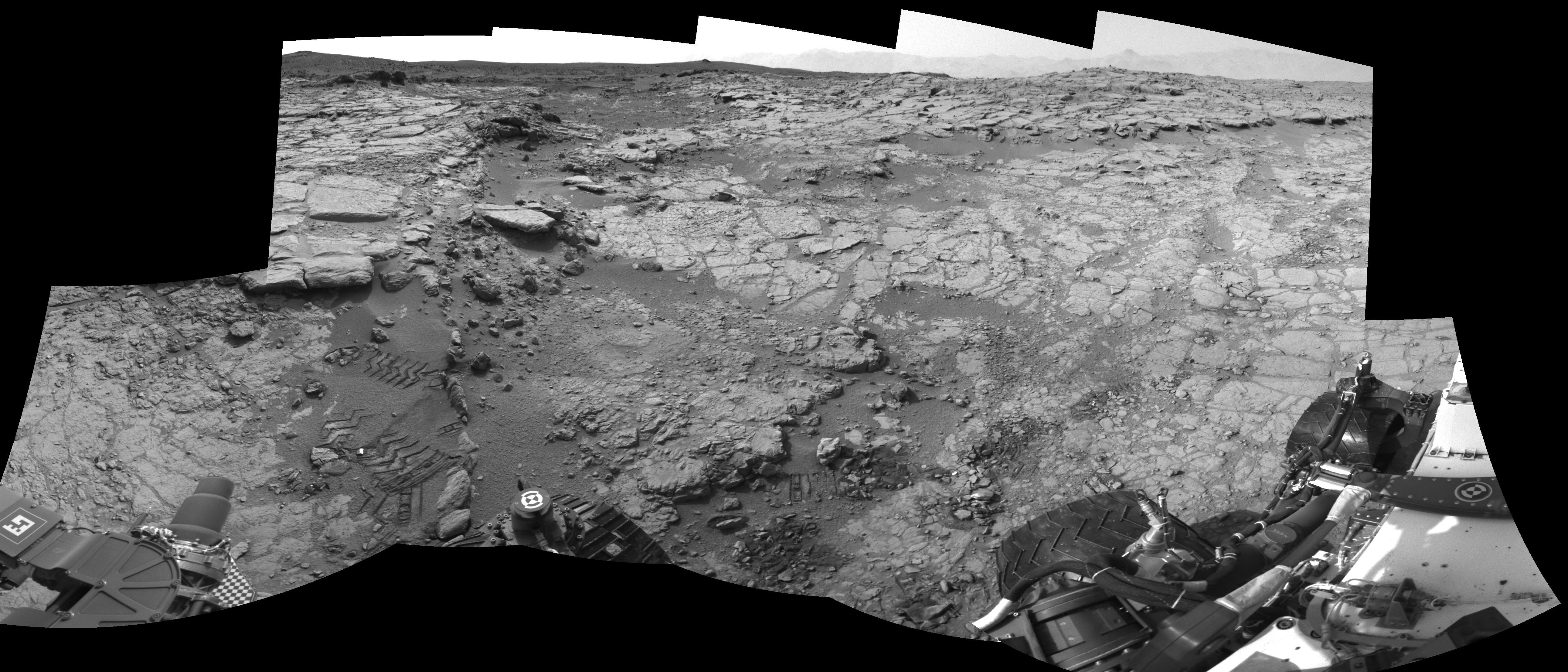 NASA's Mars rover Curiosity took 11 images in Gale Crater using its mast-mounted Right Navigation Camera (Navcam) to create this mosaic. The seam-corrected mosaic provides a 236-degree cylindrical-perspective projection panorama of the Martian surface suitable for stereo viewing, centered at 67 degrees azimuth (measured clockwise from north). This single-eye view must be combined with the partner left image to be viewed in stereo. Curiosity took the images on January 17, 2013, Sol 159 of the Mars Science Laboratory mission at drive 1986, site number 5. The local mean solar time for the image exposures was 2 PM. Each Navcam image has a 45-degree field of view. CREDIT: NASA/JPL-Caltech