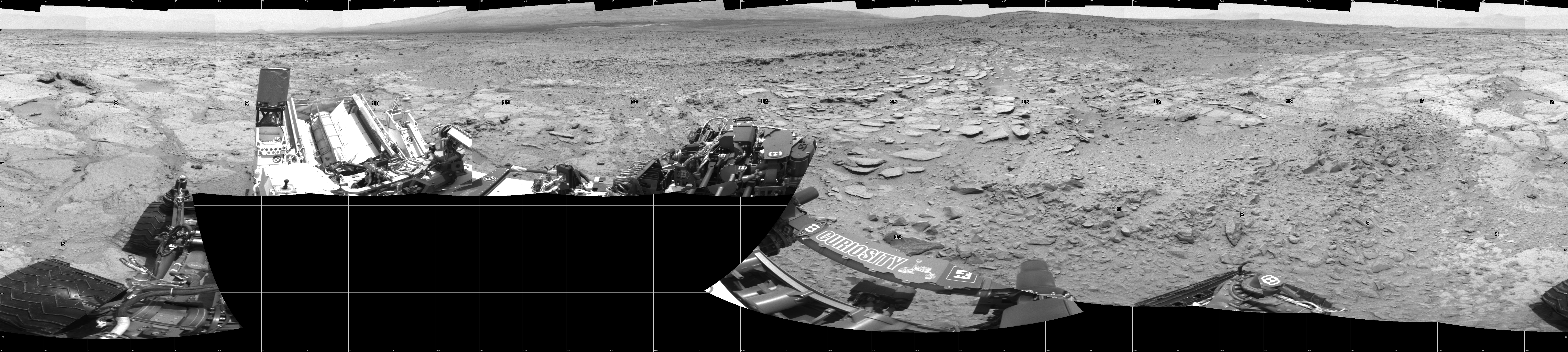 NASA's Mars rover Curiosity took 18 images in Gale Crater using its mast-mounted Left Navigation Camera (Navcam) to create this mosaic. The seam-corrected mosaic provides a 360-degree cylindrical projection panorama of the Martian surface centered at 180 degrees azimuth (measured clockwise from north). Curiosity took the images on June 19, 2013, Sol 308 of the Mars Science Laboratory mission at drive 646, site number 6. The local mean solar time for the image exposures was from 1 PM to 12 PM. Each Navcam image has a 45 degree field of view. CREDIT: NASA/JPL-Caltech