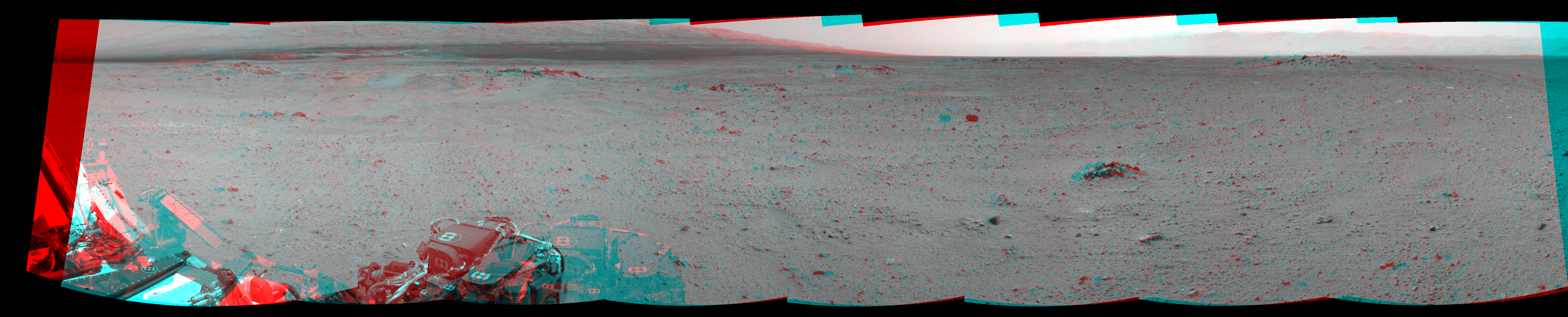 NASA's Mars rover Curiosity took 8 image pairs in Gale Crater using its mast-mounted Navigation Camera (Navcam) to create this mosaic. The seam-corrected mosaic provides a 264-degree cylindrical perspective projection panorama of the Martian surface suitable for stereo viewing, centered at 332 degrees azimuth (measured clockwise from north). This anaglyph must be viewed with red/blue glasses (red over left eye). Curiosity took the images on July 26, 2013, Sol 344 of the Mars Science Laboratory mission at drive 0, site number 10. The local mean solar time for the image exposures was from 2 PM to 3 PM. Each Navcam image has a 45-degree field of view. CREDIT: NASA/JPL-Caltech