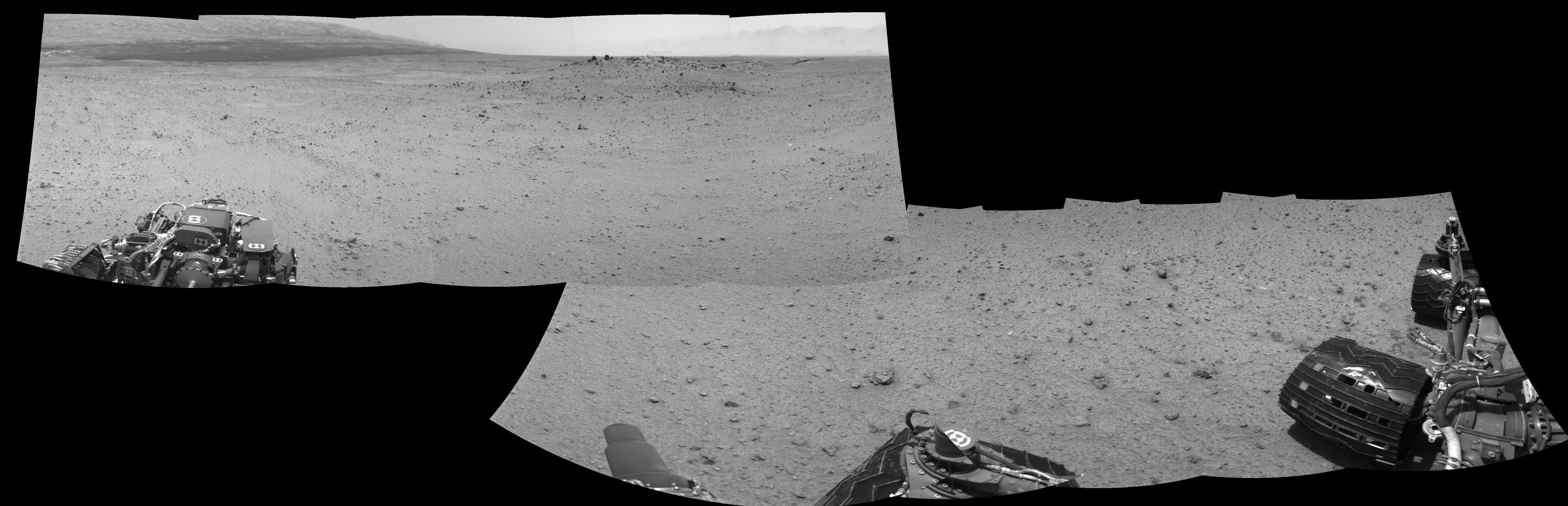NASA's Mars rover Curiosity took 10 images in Gale Crater using its mast-mounted Left Navigation Camera (Navcam) to create this mosaic. The seam-corrected mosaic provides a 297-degree cylindrical-perspective projection panorama of the Martian surface suitable for stereo viewing, centered at 45 degrees azimuth (measured clockwise from north). This single-eye view must be combined with the partner right image to be viewed in stereo. Curiosity took the images on July 27, 2013, Sol 345 of the Mars Science Laboratory mission at drive 288, site number 10. The local mean solar time for the image exposures was 1 PM. Each Navcam image has a 45-degree field of view. CREDIT: NASA/JPL-Caltech