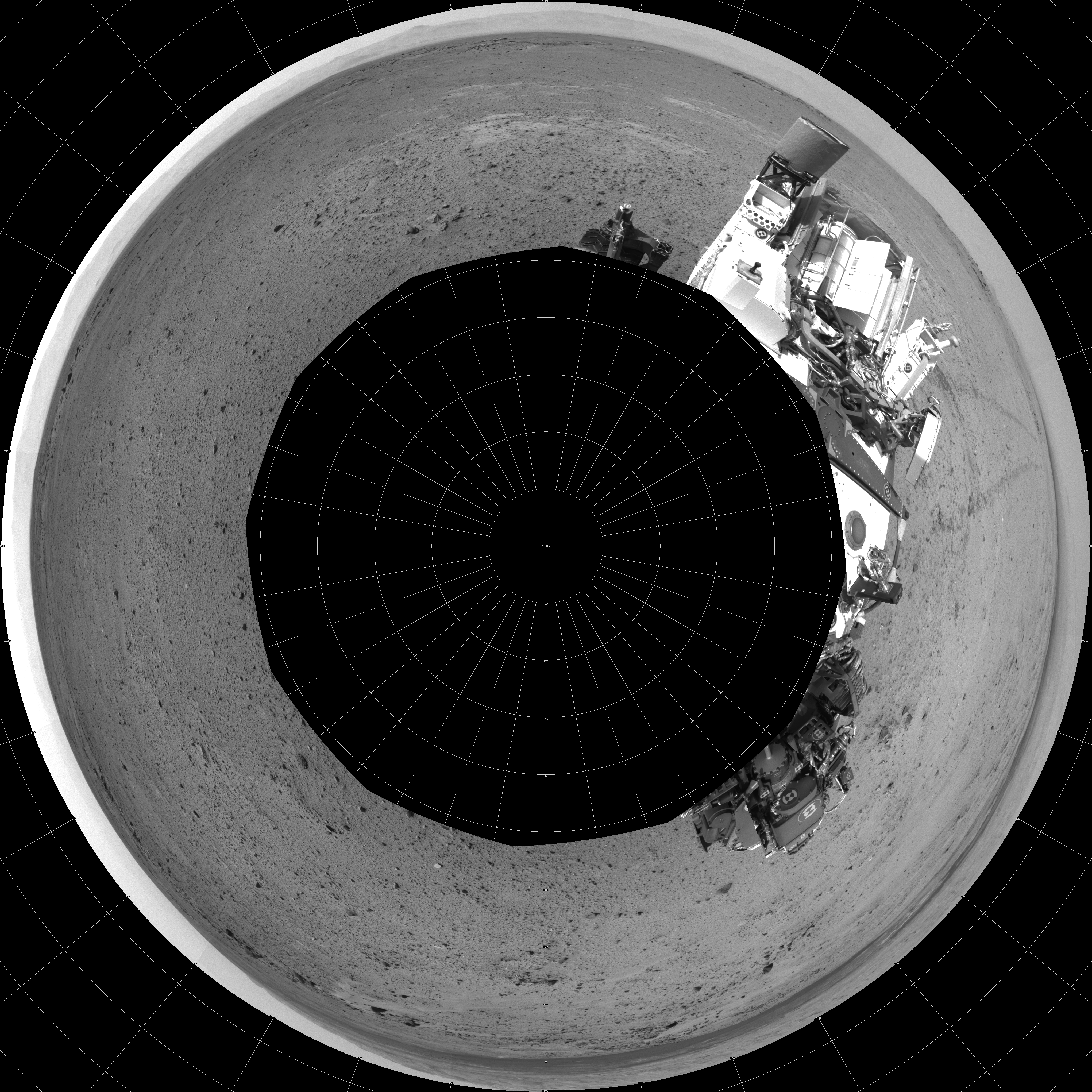 NASA's Mars rover Curiosity took 12 images in Gale Crater using its mast-mounted Left Navigation Camera (Navcam) to create this mosaic. The seam-corrected mosaic provides a polar stereographic projection panorama of the Martian surface with 0 degrees azimuth (measured clockwise from north) at the top of the image. Curiosity took the images on August 07, 2013, Sol 356 of the Mars Science Laboratory mission at drive 748, site number 11. The local mean solar time for the image exposures was 3 PM. Each Navcam image has a 45-degree field of view. CREDIT: NASA/JPL-Caltech