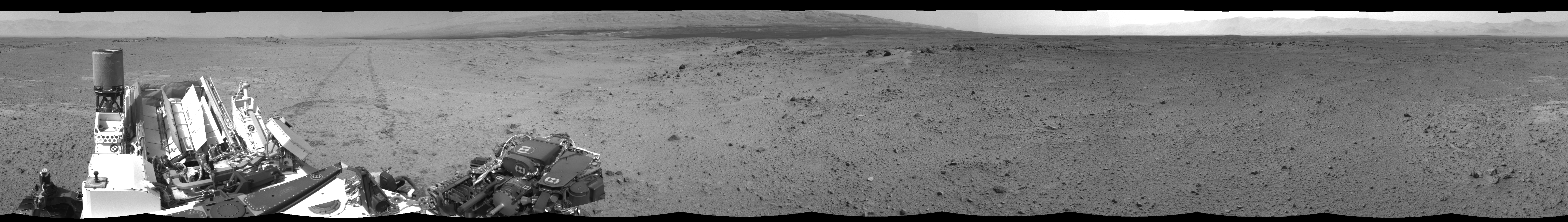 NASA's Mars rover Curiosity took 12 images in Gale Crater using its mast-mounted Right Navigation Camera (Navcam) to create this mosaic. The seam-corrected mosaic provides a 0-degree cylindrical-perspective projection panorama of the Martian surface suitable for stereo viewing, centered at 150 degrees azimuth (measured clockwise from north). This single-eye view must be combined with the partner left image to be viewed in stereo. Curiosity took the images on August 07, 2013, Sol 356 of the Mars Science Laboratory mission at drive 748, site number 11. The local mean solar time for the image exposures was 3 PM. Each Navcam image has a 45-degree field of view. CREDIT: NASA/JPL-Caltech