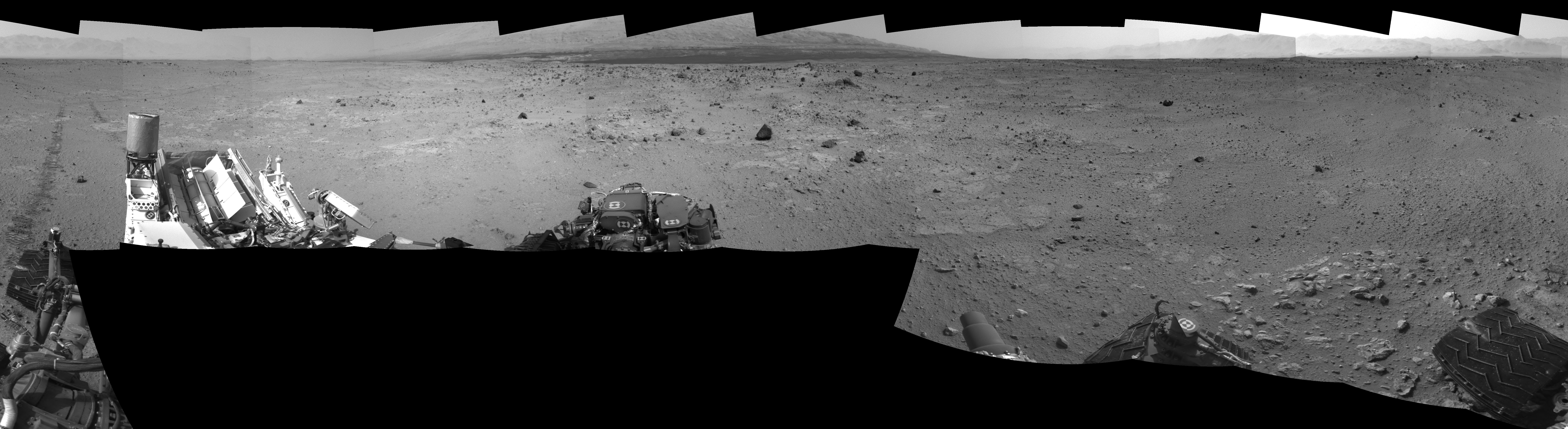 NASA's Mars rover Curiosity took 17 images in Gale Crater using its mast-mounted Left Navigation Camera (Navcam) to create this mosaic. The seam-corrected mosaic provides a 360-degree cylindrical-perspective projection panorama of the Martian surface suitable for stereo viewing, centered at 335 degrees azimuth (measured clockwise from north). This single-eye view must be combined with the partner right image to be viewed in stereo. Curiosity took the images on August 22, 2013, Sol 371 of the Mars Science Laboratory mission at drive 974, site number 13. The local mean solar time for the image exposures was from 2 PM to 3 PM. Each Navcam image has a 45-degree field of view. CREDIT: NASA/JPL-Caltech