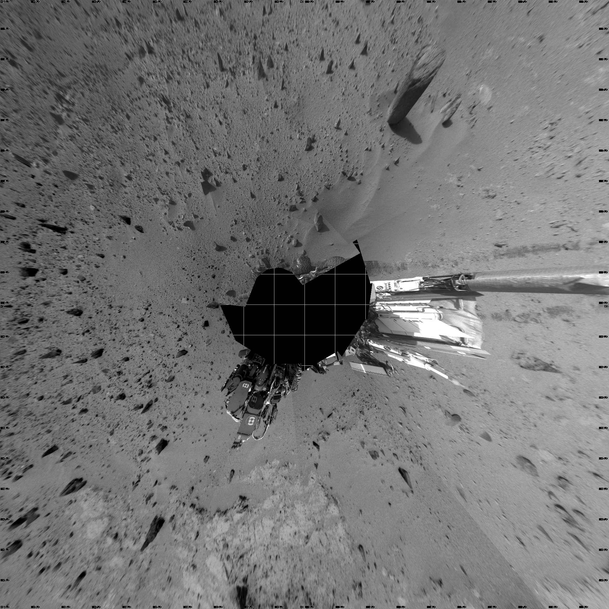 NASA's Mars rover Curiosity took 17 images in Gale Crater using its mast-mounted Left Navigation Camera (Navcam) to create this mosaic. The seam-corrected mosaic provides a vertical projection of the Martian surface near the rover, covering an area of 20 meters (north/south) by 20 meters (east/west). North is up in the image. This projection provides an overhead view, but introduces distortion for items not on the surface, such as large rocks and the rover itself. Curiosity took the images on September 23, 2013, Sol 402 of the Mars Science Laboratory mission at drive 328, site number 16. The local mean solar time for the image exposures was from 4 PM to 12 PM. Each Navcam image has a 45-degree field of view. CREDIT: NASA/JPL-Caltech