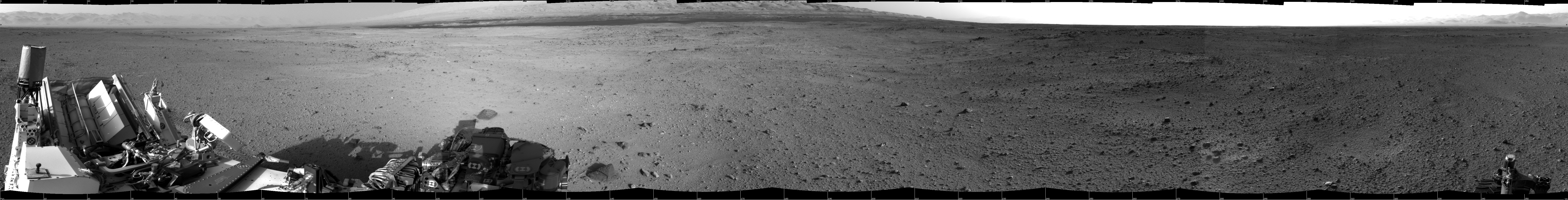 NASA's Mars rover Curiosity took 12 images in Gale Crater using its mast-mounted Left Navigation Camera (Navcam) to create this mosaic. The seam-corrected mosaic provides a 360-degree cylindrical projection panorama of the Martian surface centered at 180 degrees azimuth (measured clockwise from north). Curiosity took the images on October 11, 2013, Sol 419 of the Mars Science Laboratory mission at drive 0, site number 19. The local mean solar time for the image exposures was 4 PM. Each Navcam image has a 45 degree field of view. CREDIT: NASA/JPL-Caltech