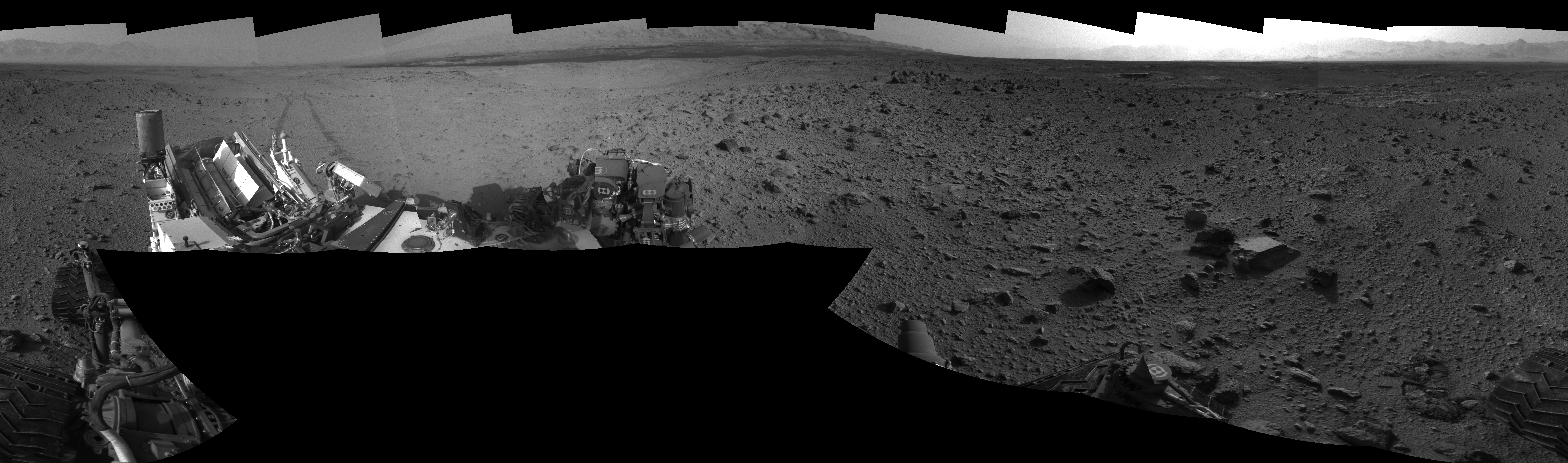 NASA's Mars rover Curiosity took 17 images in Gale Crater using its mast-mounted Left Navigation Camera (Navcam) to create this mosaic. The seam-corrected mosaic provides a 360-degree cylindrical-perspective projection panorama of the Martian surface suitable for stereo viewing, centered at 335 degrees azimuth (measured clockwise from north). This single-eye view must be combined with the partner right image to be viewed in stereo. Curiosity took the images on October 18, 2013, Sol 426 of the Mars Science Laboratory mission at drive 0, site number 20. The local mean solar time for the image exposures was 4 PM. Each Navcam image has a 45-degree field of view. CREDIT: NASA/JPL-Caltech