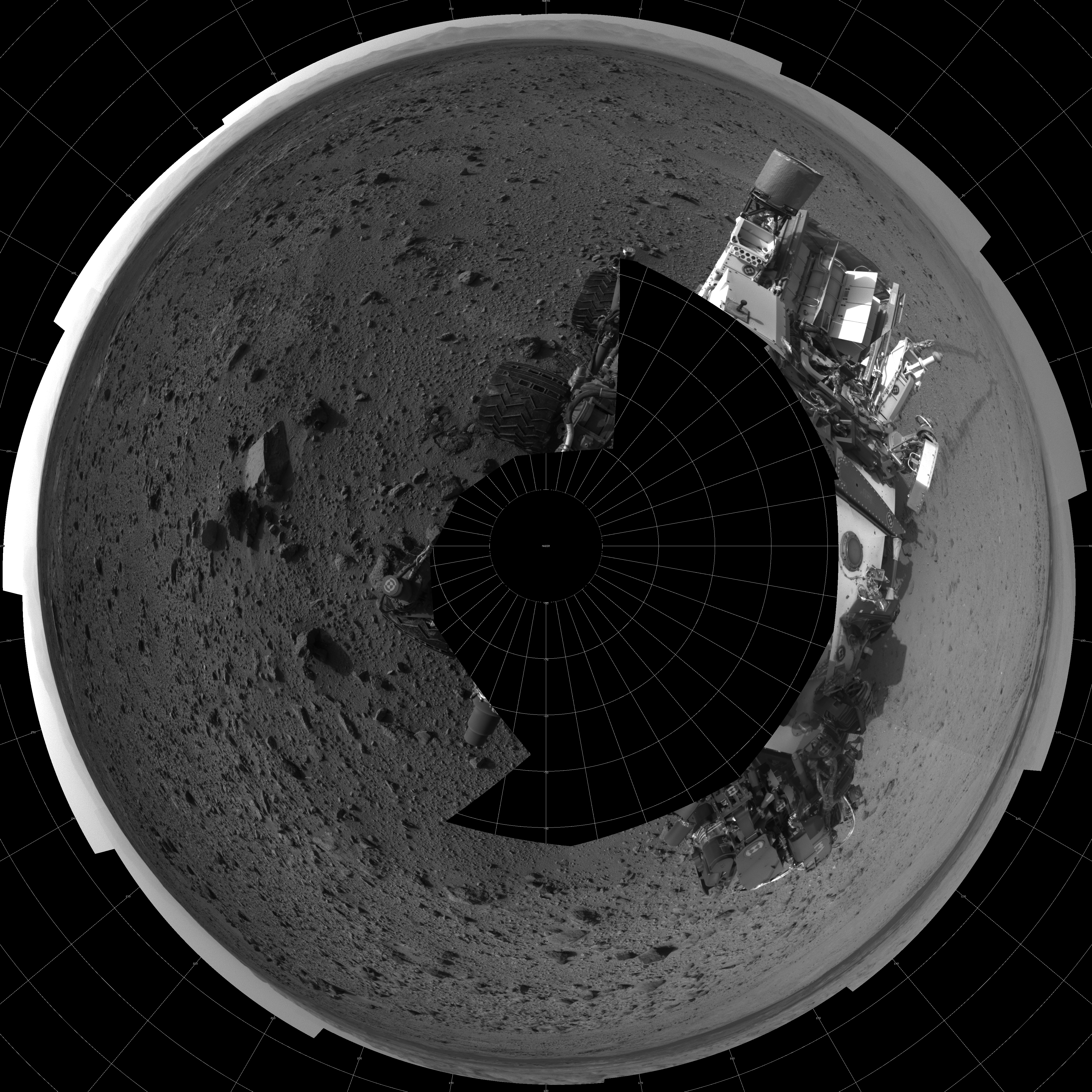 NASA's Mars rover Curiosity took 17 images in Gale Crater using its mast-mounted Left Navigation Camera (Navcam) to create this mosaic. The seam-corrected mosaic provides a polar stereographic projection panorama of the Martian surface with 0 degrees azimuth (measured clockwise from north) at the top of the image. Curiosity took the images on October 18, 2013, Sol 426 of the Mars Science Laboratory mission at drive 0, site number 20. The local mean solar time for the image exposures was 4 PM. Each Navcam image has a 45-degree field of view. CREDIT: NASA/JPL-Caltech