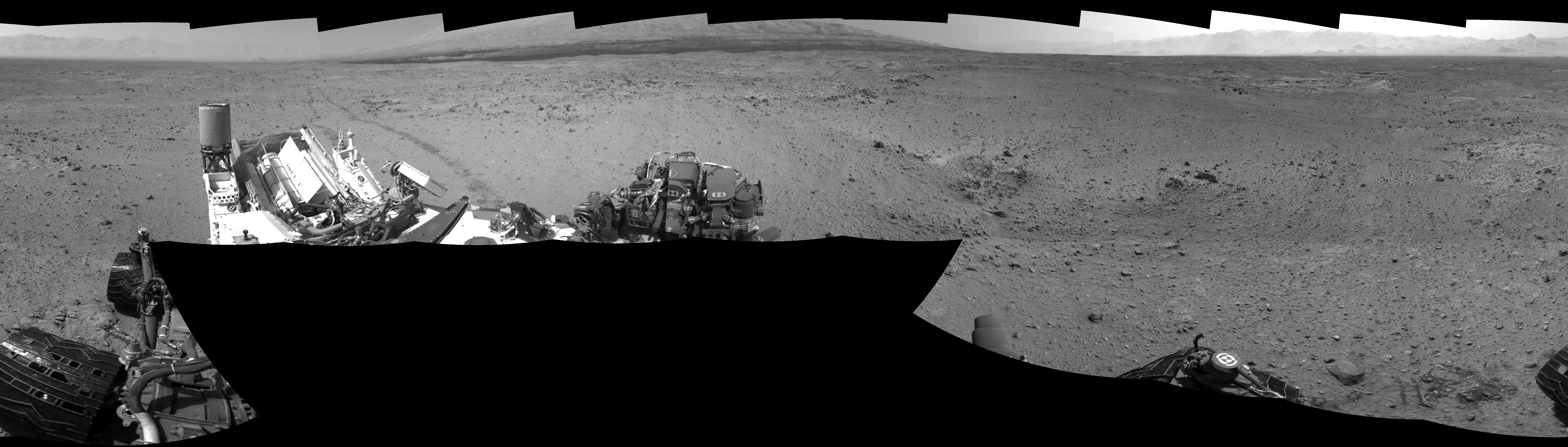 NASA's Mars rover Curiosity took 17 images in Gale Crater using its mast-mounted Left Navigation Camera (Navcam) to create this mosaic. The seam-corrected mosaic provides a 360-degree cylindrical-perspective projection panorama of the Martian surface suitable for stereo viewing, centered at 319 degrees azimuth (measured clockwise from north). This single-eye view must be combined with the partner right image to be viewed in stereo. Curiosity took the images on October 25, 2013, Sol 433 of the Mars Science Laboratory mission at drive 0, site number 21. The local mean solar time for the image exposures was 2 PM. Each Navcam image has a 45-degree field of view. CREDIT: NASA/JPL-Caltech