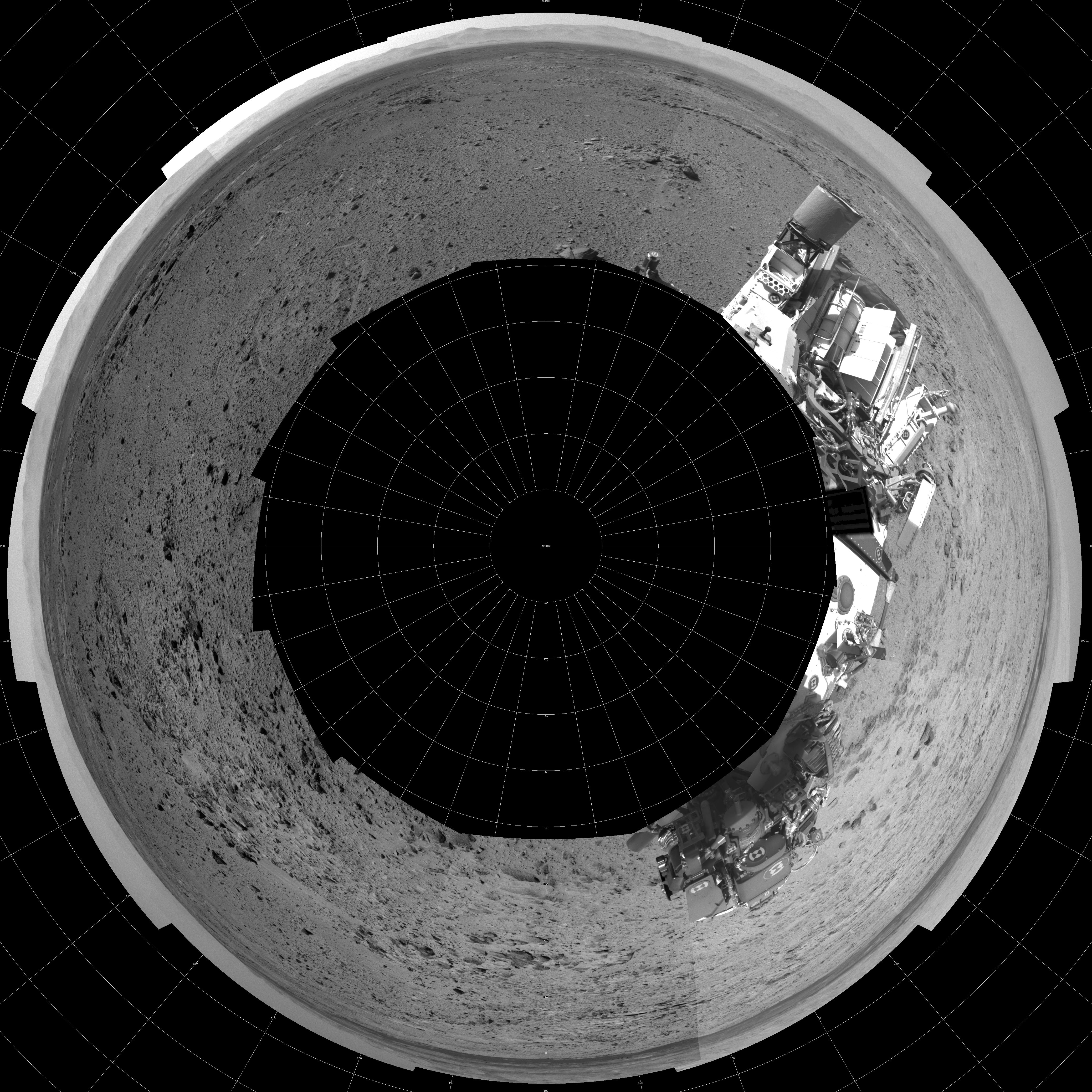 NASA's Mars rover Curiosity took 12 images in Gale Crater using its mast-mounted Left Navigation Camera (Navcam) to create this mosaic. The seam-corrected mosaic provides a polar stereographic projection panorama of the Martian surface with 0 degrees azimuth (measured clockwise from north) at the top of the image. Curiosity took the images on November 16, 2013, Sol 454 of the Mars Science Laboratory mission at drive 0, site number 23. The local mean solar time for the image exposures was from 2 PM to 3 PM. Each Navcam image has a 45-degree field of view. CREDIT: NASA/JPL-Caltech