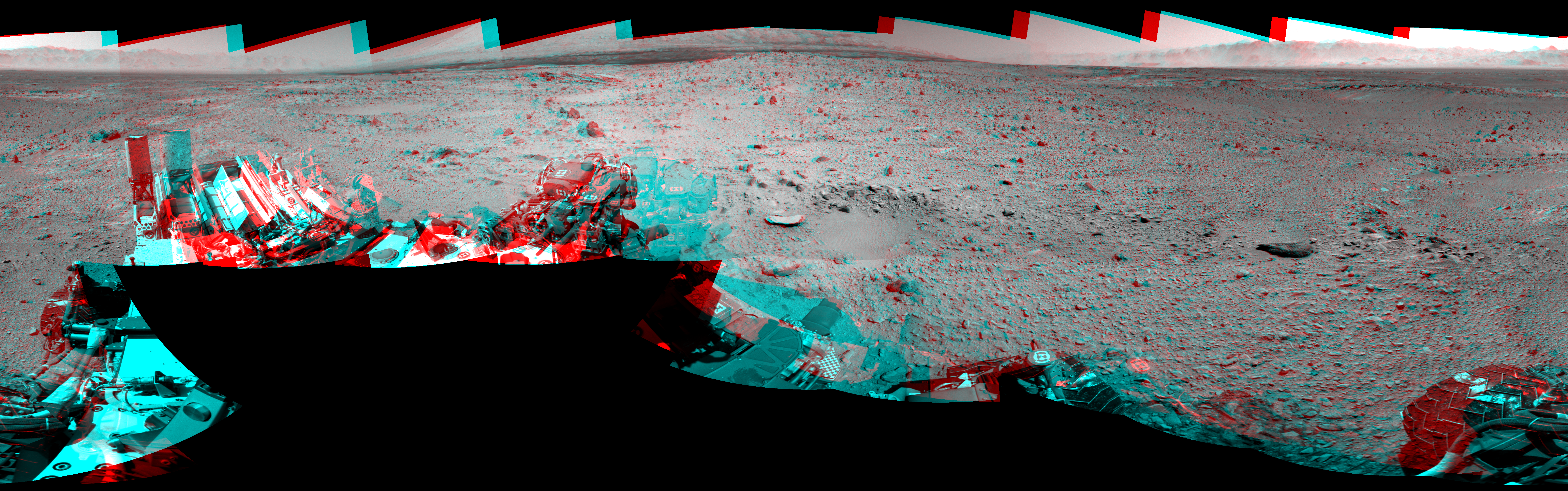 NASA's Mars rover Curiosity took 19 image pairs in Gale Crater using its mast-mounted Navigation Camera (Navcam) to create this mosaic. The seam-corrected mosaic provides a 360-degree cylindrical perspective projection panorama of the Martian surface suitable for stereo viewing, centered at 329 degrees azimuth (measured clockwise from north). This anaglyph must be viewed with red/blue glasses (red over left eye). Curiosity took the images on December 27, 2013, Sol 494 of the Mars Science Laboratory mission at drive 0, site number 25. The local mean solar time for the image exposures was from 1 PM to 2 PM. Each Navcam image has a 45-degree field of view. CREDIT: NASA/JPL-Caltech
