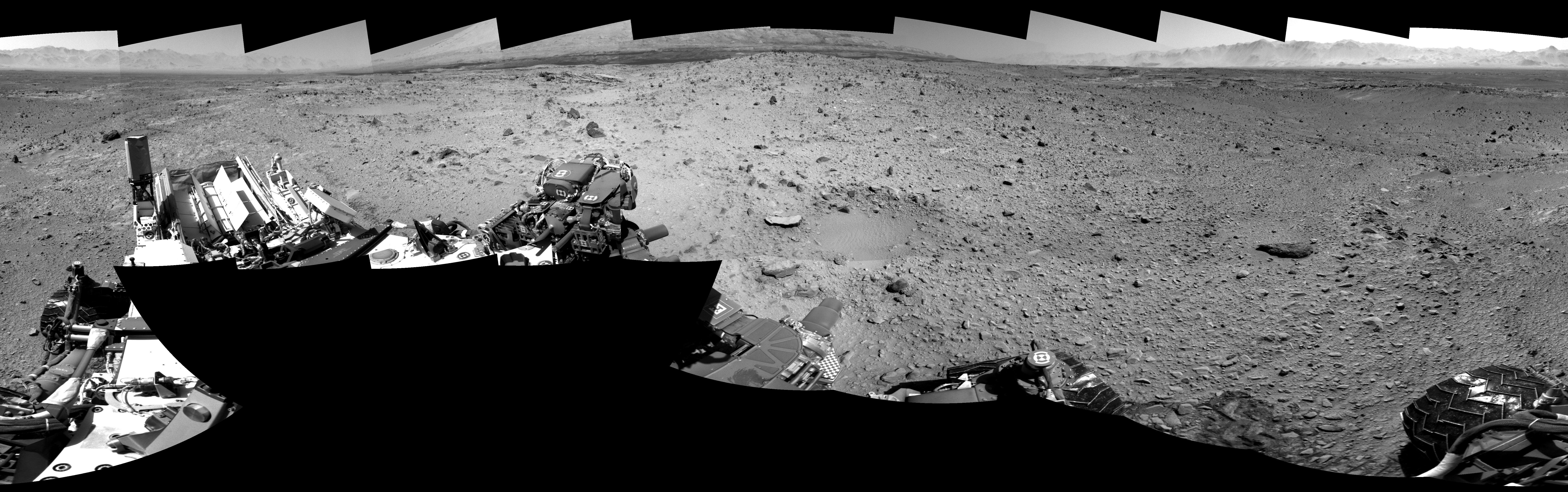 NASA's Mars rover Curiosity took 19 images in Gale Crater using its mast-mounted Right Navigation Camera (Navcam) to create this mosaic. The seam-corrected mosaic provides a 0-degree cylindrical-perspective projection panorama of the Martian surface suitable for stereo viewing, centered at 145 degrees azimuth (measured clockwise from north). This single-eye view must be combined with the partner left image to be viewed in stereo. Curiosity took the images on December 27, 2013, Sol 494 of the Mars Science Laboratory mission at drive 0, site number 25. The local mean solar time for the image exposures was from 1 PM to 2 PM. Each Navcam image has a 45-degree field of view. CREDIT: NASA/JPL-Caltech