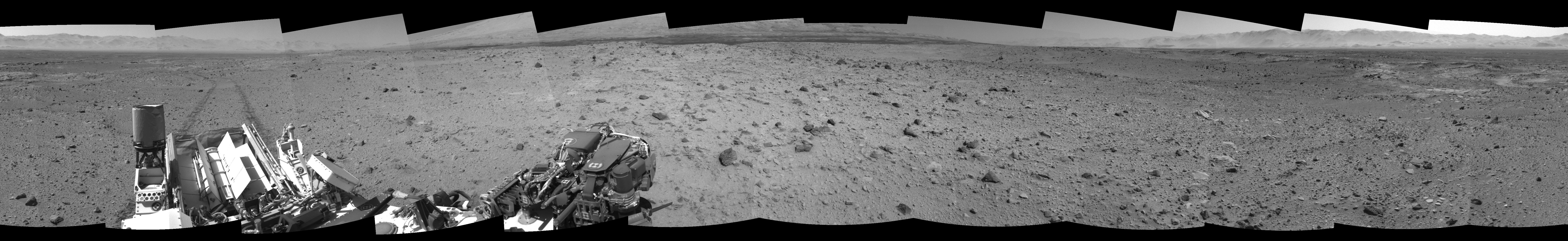 NASA's Mars rover Curiosity took 12 images in Gale Crater using its mast-mounted Right Navigation Camera (Navcam) to create this mosaic. The seam-corrected mosaic provides a 0-degree cylindrical-perspective projection panorama of the Martian surface suitable for stereo viewing, centered at 143 degrees azimuth (measured clockwise from north). This single-eye view must be combined with the partner left image to be viewed in stereo. Curiosity took the images on January 17, 2014, Sol 515 of the Mars Science Laboratory mission at drive 750, site number 25. The local mean solar time for the image exposures was from 1 PM to 2 PM. Each Navcam image has a 45-degree field of view. CREDIT: NASA/JPL-Caltech