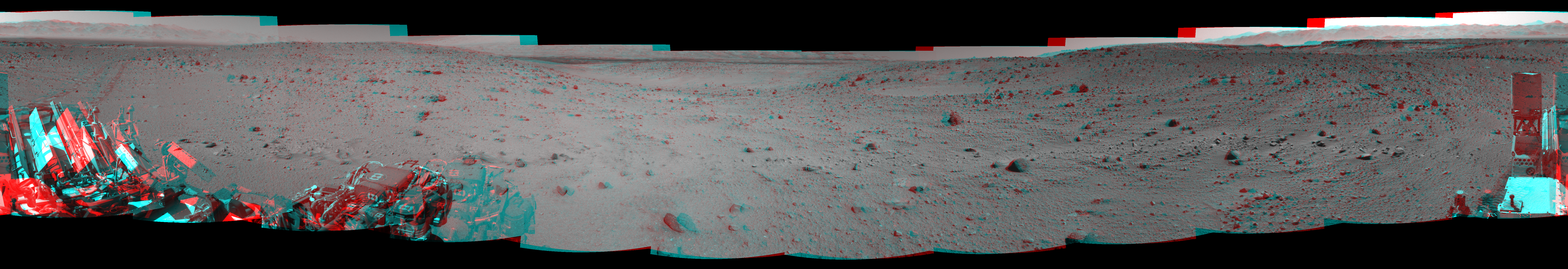 NASA's Mars rover Curiosity took 12 image pairs in Gale Crater using its mast-mounted Navigation Camera (Navcam) to create this mosaic. The seam-corrected mosaic provides a 360-degree cylindrical perspective projection panorama of the Martian surface suitable for stereo viewing, centered at 9 degrees azimuth (measured clockwise from north). This anaglyph must be viewed with red/blue glasses (red over left eye). Curiosity took the images on January 23, 2014, Sol 521 of the Mars Science Laboratory mission at drive 1296, site number 25. The local mean solar time for the image exposures was 2 PM. Each Navcam image has a 45-degree field of view. CREDIT: NASA/JPL-Caltech