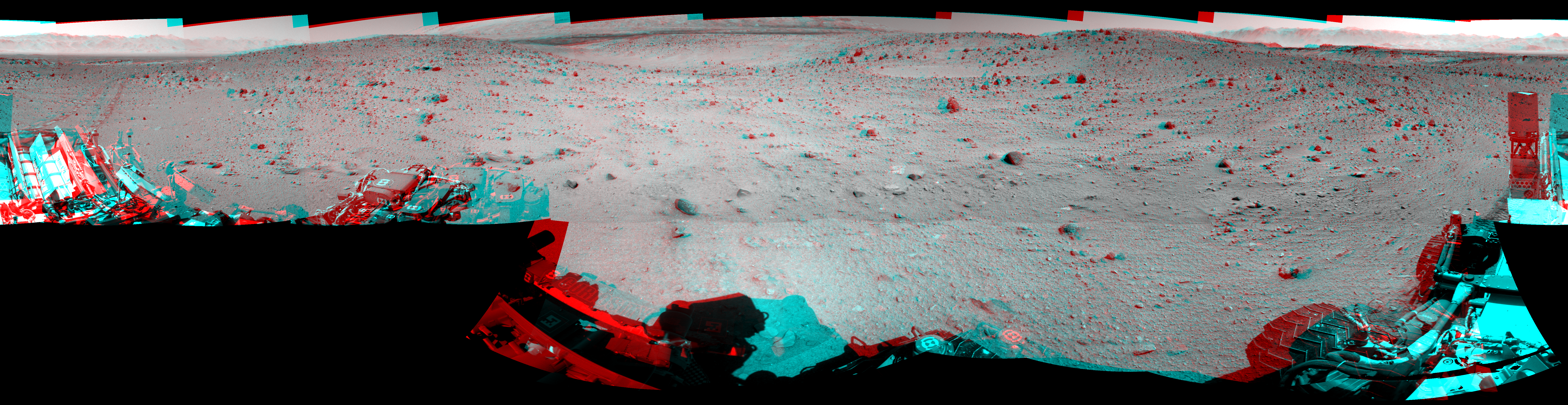 NASA's Mars rover Curiosity took 19 image pairs in Gale Crater using its mast-mounted Navigation Camera (Navcam) to create this mosaic. The seam-corrected mosaic provides a 360-degree cylindrical perspective projection panorama of the Martian surface suitable for stereo viewing, centered at 9 degrees azimuth (measured clockwise from north). This anaglyph must be viewed with red/blue glasses (red over left eye). Curiosity took the images on January 24, 2014, Sol 522 of the Mars Science Laboratory mission at drive 1296, site number 25. The local mean solar time for the image exposures was from 1 PM to 12 PM. Each Navcam image has a 45-degree field of view. CREDIT: NASA/JPL-Caltech