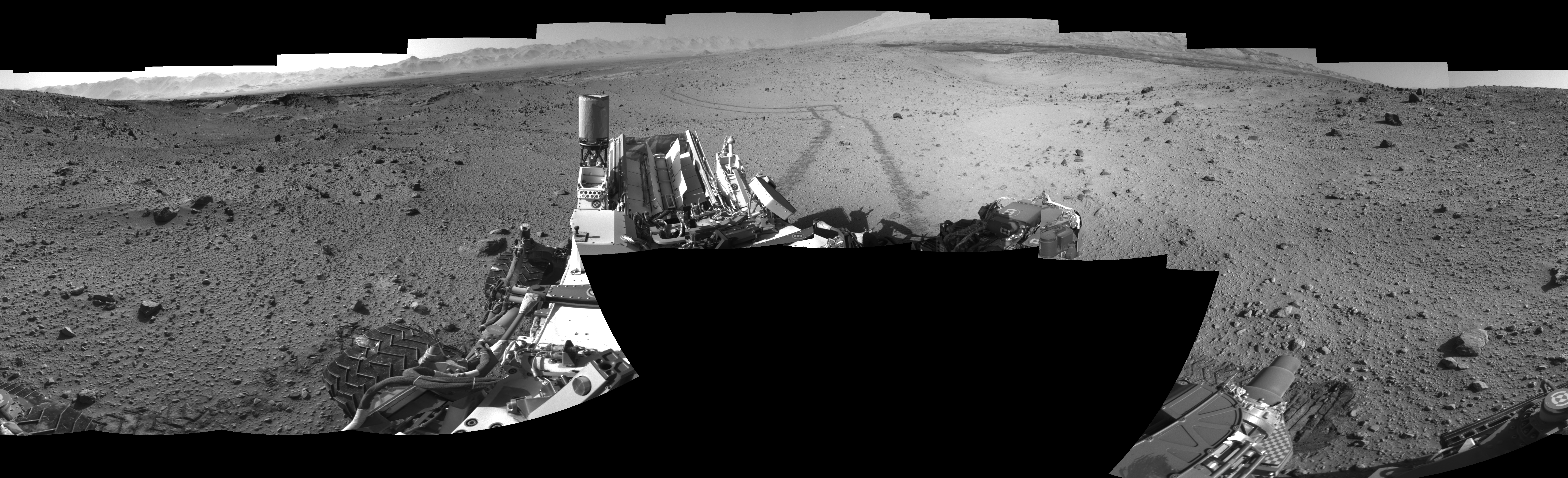 NASA's Mars rover Curiosity took 19 images in Gale Crater using its mast-mounted Right Navigation Camera (Navcam) to create this mosaic. The seam-corrected mosaic provides a 0-degree cylindrical-perspective projection panorama of the Martian surface suitable for stereo viewing, centered at 38 degrees azimuth (measured clockwise from north). This single-eye view must be combined with the partner left image to be viewed in stereo. Curiosity took the images on January 27, 2014, Sol 524 of the Mars Science Laboratory mission at drive 1496, site number 25. The local mean solar time for the image exposures was 3 PM. Each Navcam image has a 45-degree field of view. CREDIT: NASA/JPL-Caltech