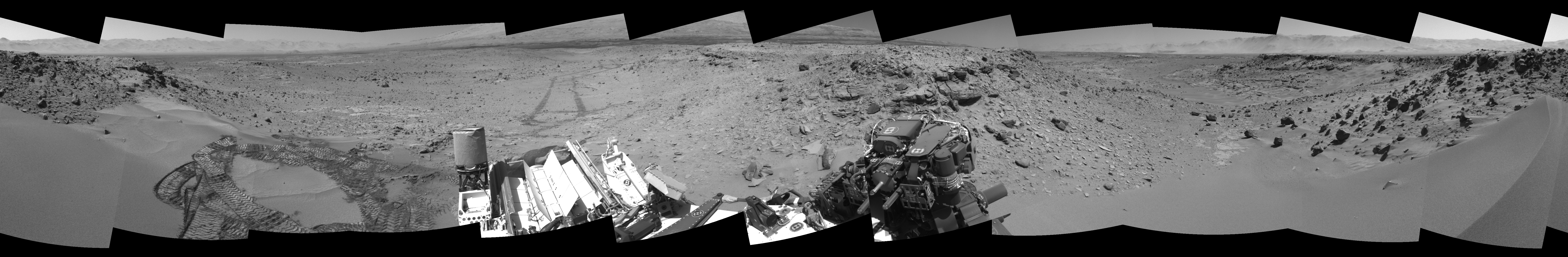 NASA's Mars rover Curiosity took 12 images in Gale Crater using its mast-mounted Right Navigation Camera (Navcam) to create this mosaic. The seam-corrected mosaic provides a 360-degree cylindrical-perspective projection panorama of the Martian surface suitable for stereo viewing, centered at 249 degrees azimuth (measured clockwise from north). This single-eye view must be combined with the partner left image to be viewed in stereo. Curiosity took the images on February 05, 2014, Sol 533 of the Mars Science Laboratory mission at drive 292, site number 26. The local mean solar time for the image exposures was from 1 PM to 12 PM. Each Navcam image has a 45-degree field of view. CREDIT: NASA/JPL-Caltech