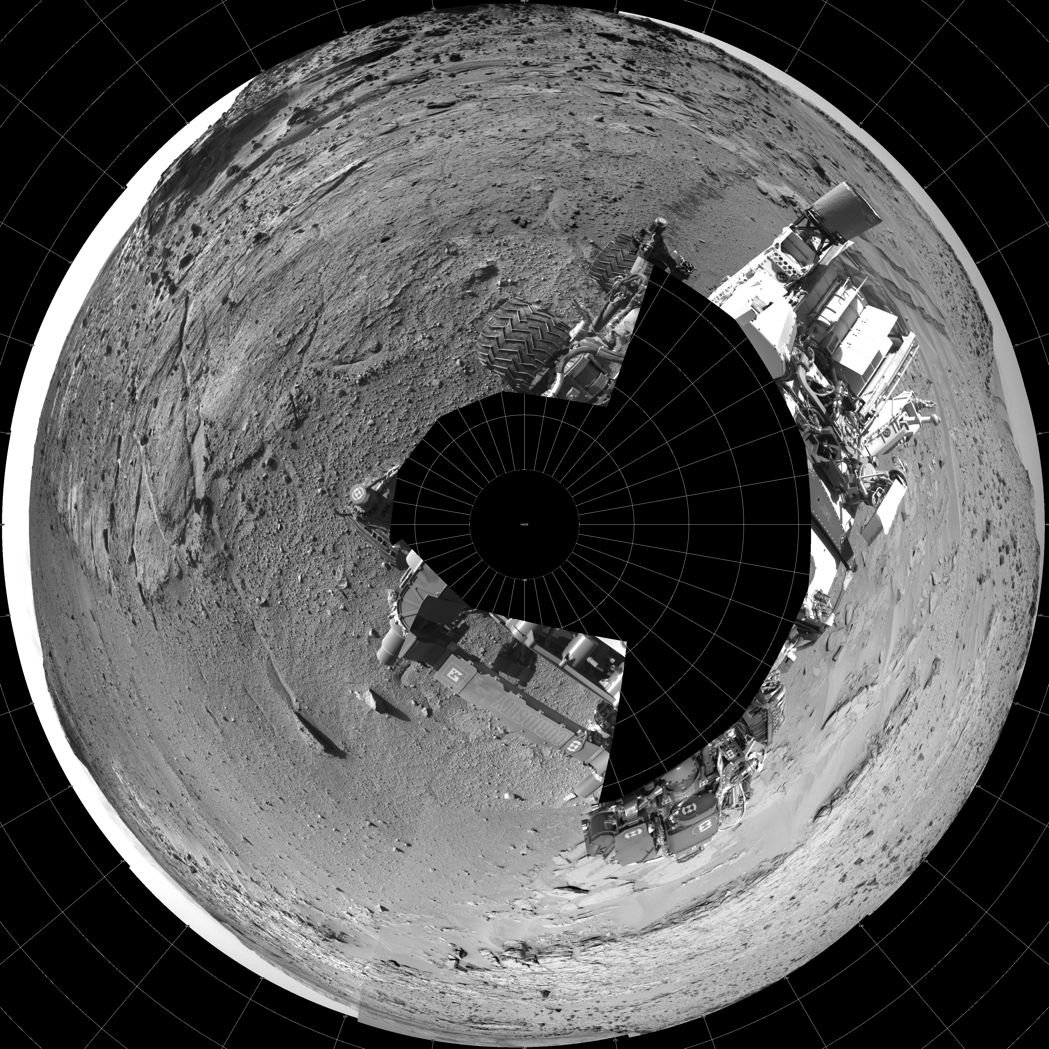NASA's Mars rover Curiosity took 19 images in Gale Crater using its mast-mounted Left Navigation Camera (Navcam) to create this mosaic. The seam-corrected mosaic provides a polar stereographic projection panorama of the Martian surface with 0 degrees azimuth (measured clockwise from north) at the top of the image. Curiosity took the images on February 11, 2014, Sols 539-538 of the Mars Science Laboratory mission at drive 708, site number 26. The local mean solar time for the image exposures was from 1 PM to 3 PM. Each Navcam image has a 45-degree field of view. CREDIT: NASA/JPL-Caltech