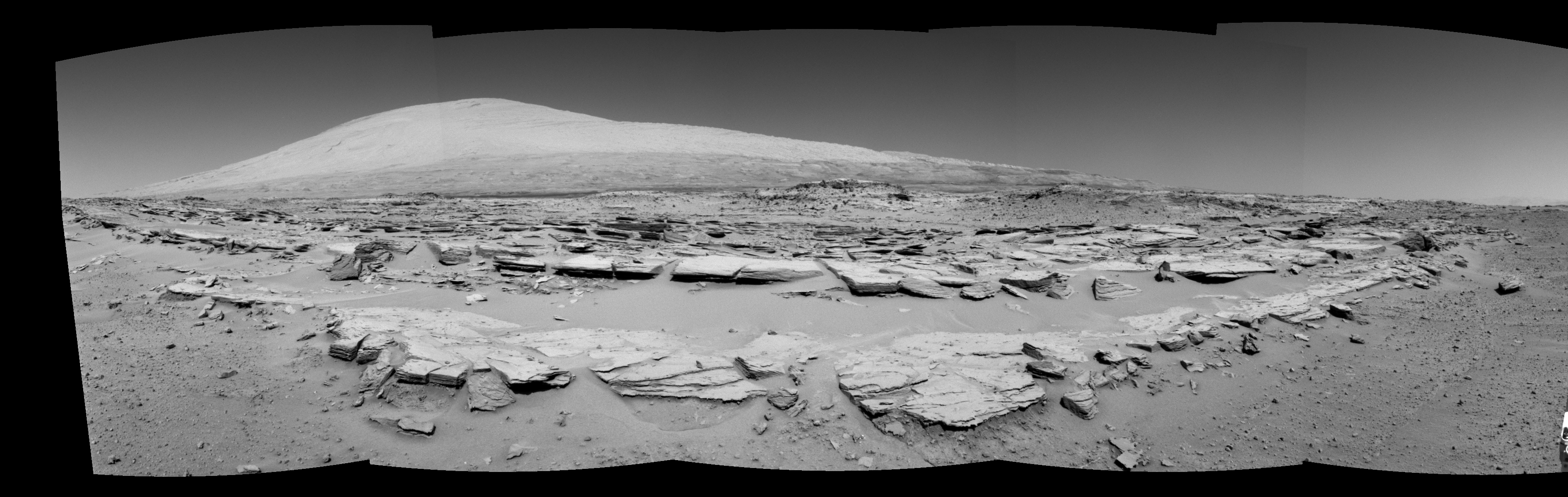 NASA's Mars rover Curiosity took 5 images in Gale Crater using its mast-mounted Right Navigation Camera (Navcam) to create this mosaic. The seam-corrected mosaic provides a 166-degree cylindrical-perspective projection panorama of the Martian surface suitable for stereo viewing, centered at 89 degrees azimuth (measured clockwise from north). This single-eye view must be combined with the partner left image to be viewed in stereo. Curiosity took the images on February 20, 2014, Sol 548 of the Mars Science Laboratory mission at drive 802, site number 27. The local mean solar time for the image exposures was 1 PM. Each Navcam image has a 45-degree field of view. CREDIT: NASA/JPL-Caltech