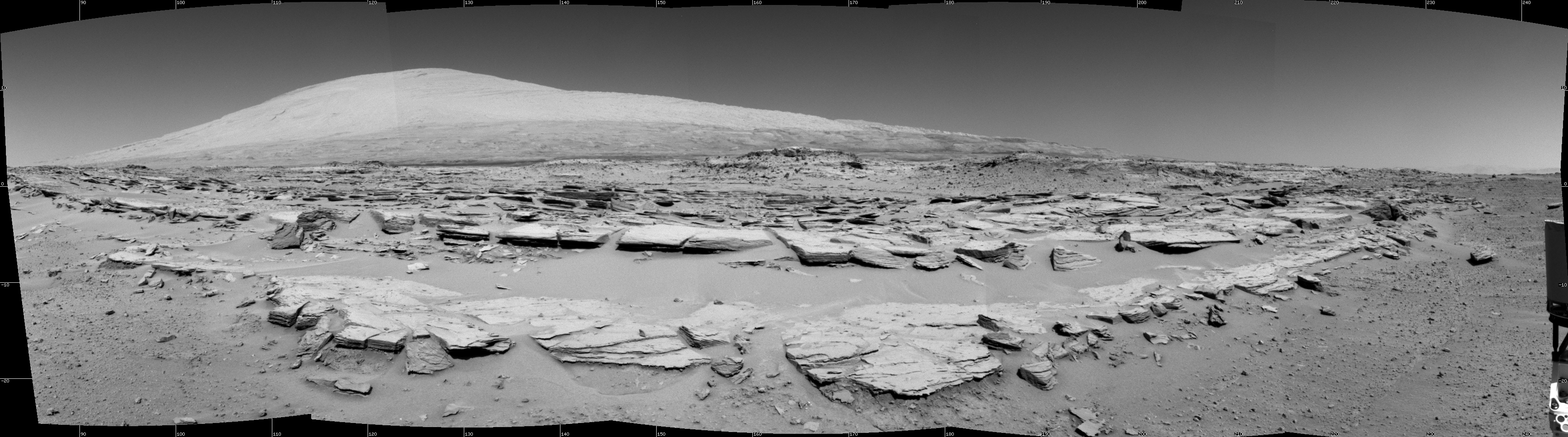 NASA's Mars rover Curiosity took 5 images in Gale Crater using its mast-mounted Right Navigation Camera (Navcam) to create this mosaic. The seam-corrected mosaic provides a 163-degree cylindrical projection panorama of the Martian surface centered at 163 degrees azimuth (measured clockwise from north). Curiosity took the images on February 20, 2014, Sol 548 of the Mars Science Laboratory mission at drive 802, site number 27. The local mean solar time for the image exposures was 1 PM. Each Navcam image has a 45 degree field of view. CREDIT: NASA/JPL-Caltech